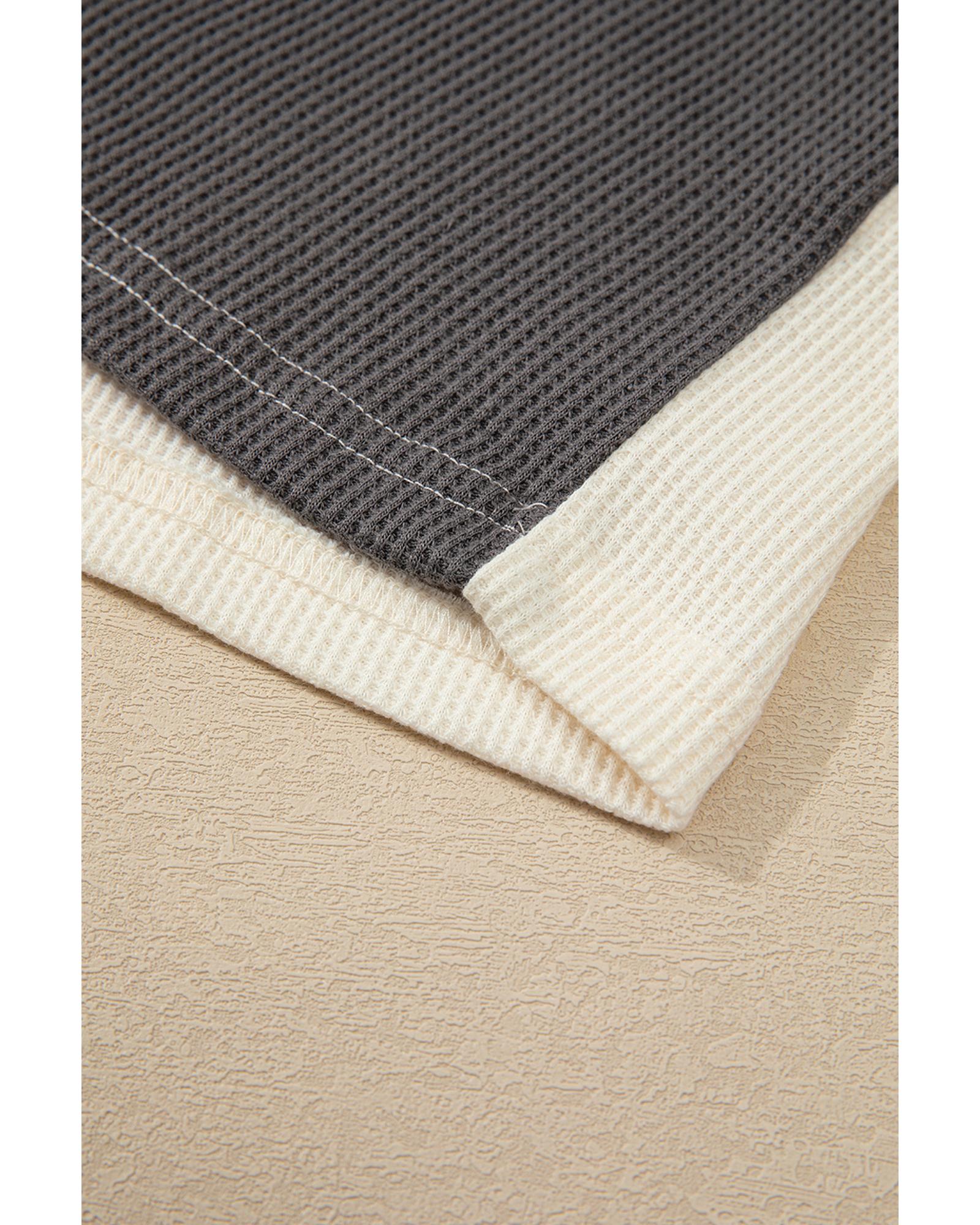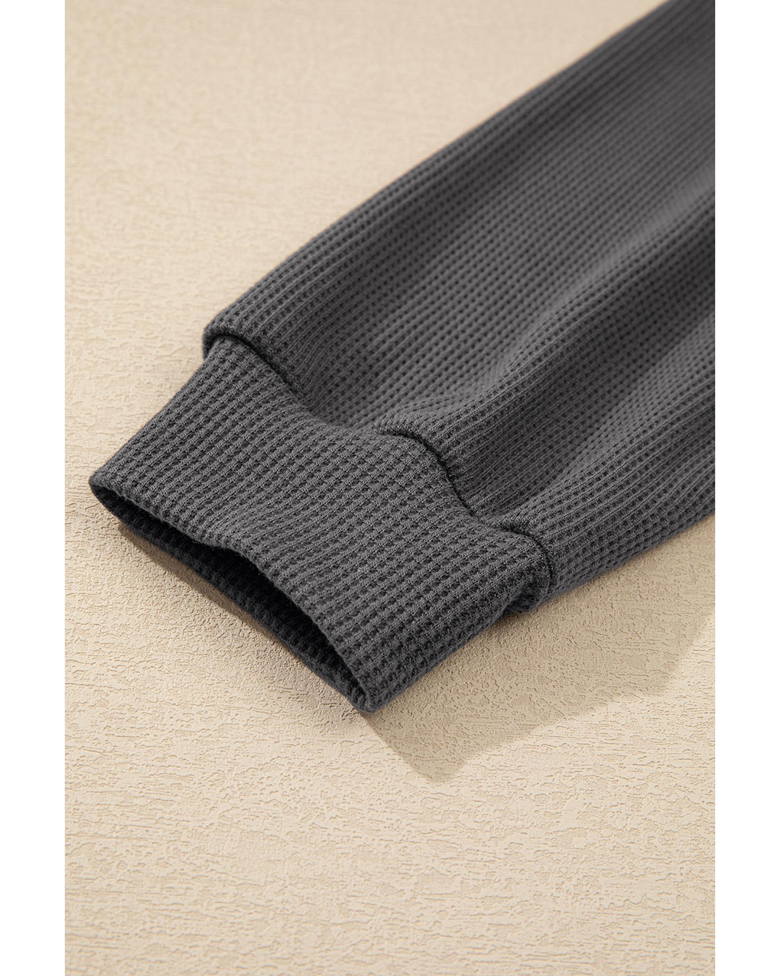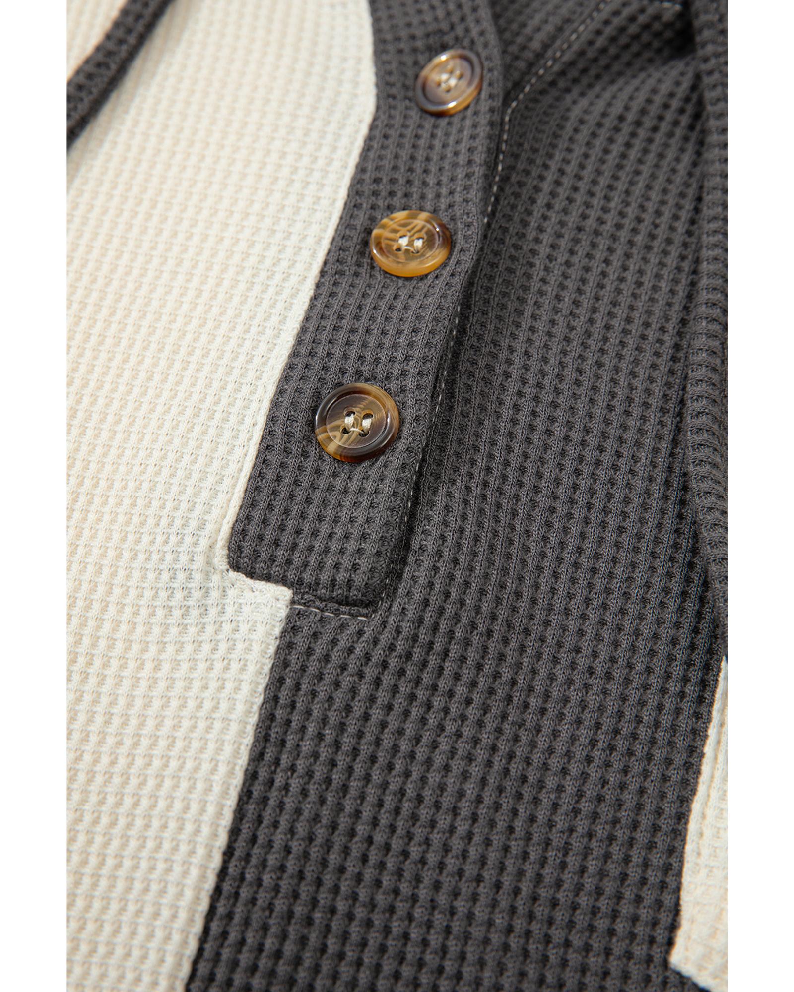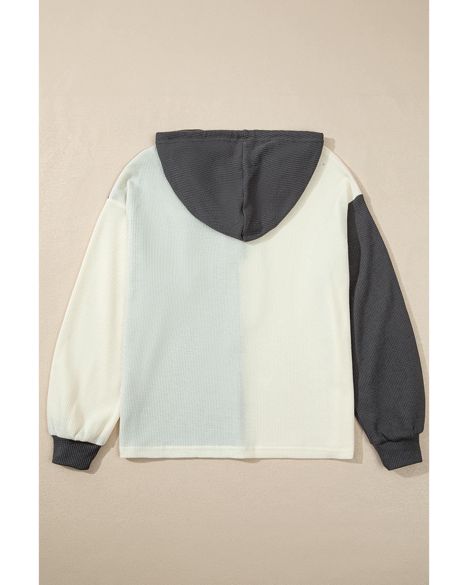 Dark Grey Waffle Colorblock Buttons Placket Drop Shoulder Drawstring Hoodie – S