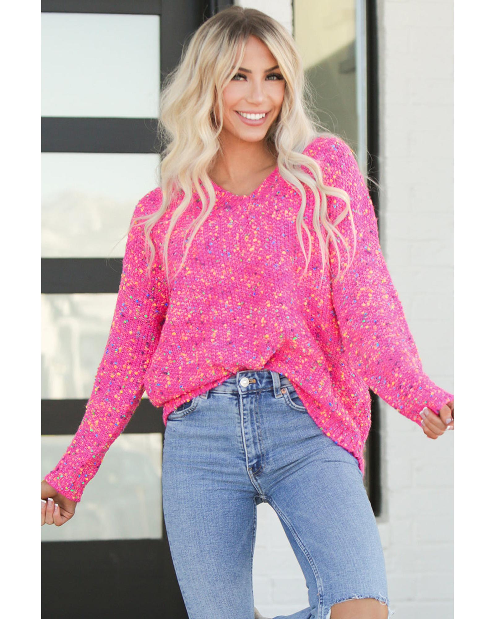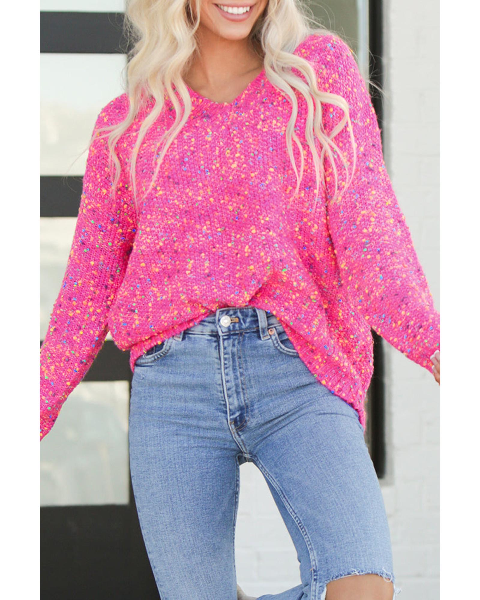 Dark Pink Colorful Spots Knitted V Neck Casual Sweater – S