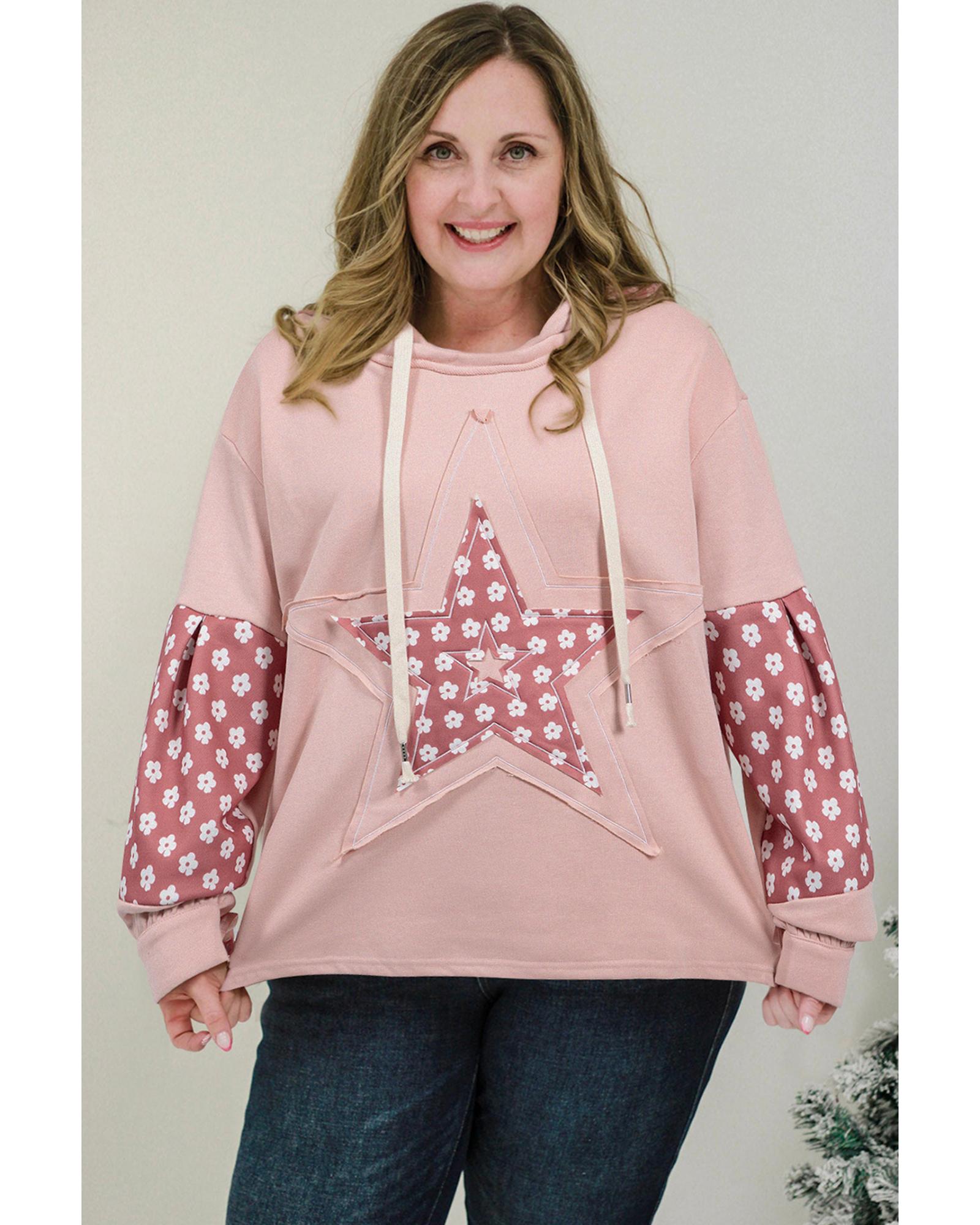 Delicacy Star Patch Graphic Floral Color Block Drawstring Plus Size Hoodie – 3X