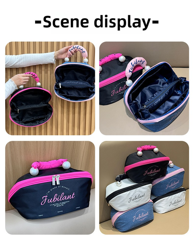 Denim Blue Portable Waterproof Color Block Makeup Bag with Pearl Handle, Large Capacity Cosmetic Storage Organizer for Travel and Daily Use