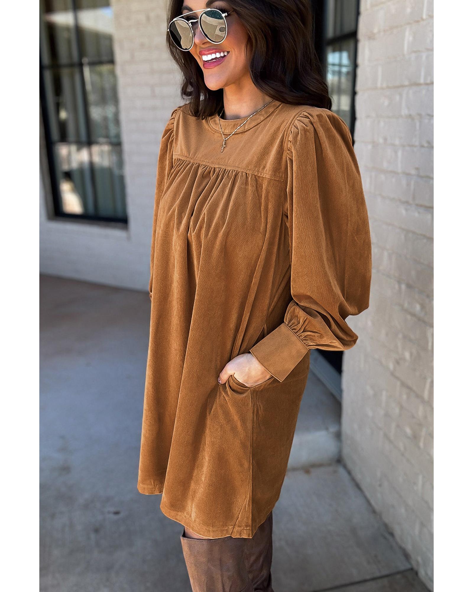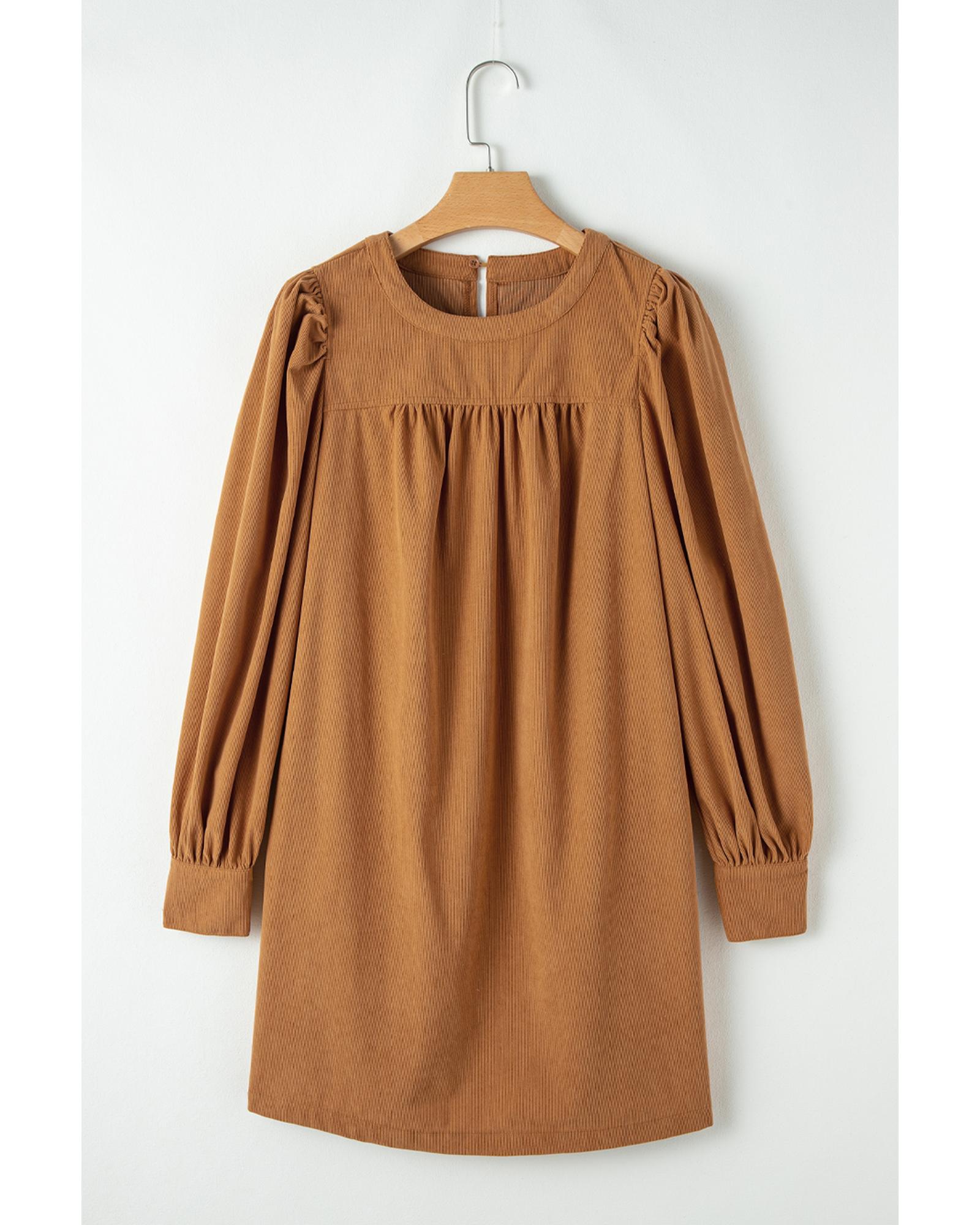 - Luxurious and elegant Desert Gold Corduroy Pleated Puff Sleeve Shift Short Dress