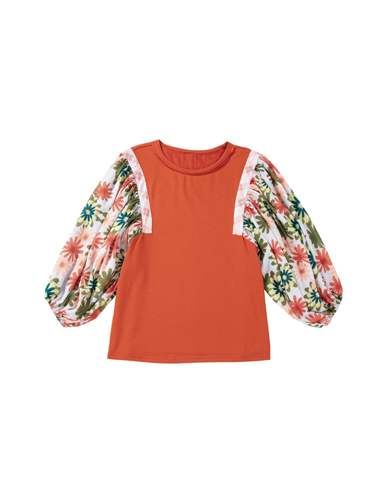 Orange Floral Color Block Patchwork Ruffled Hem Round Neck Blouse - M