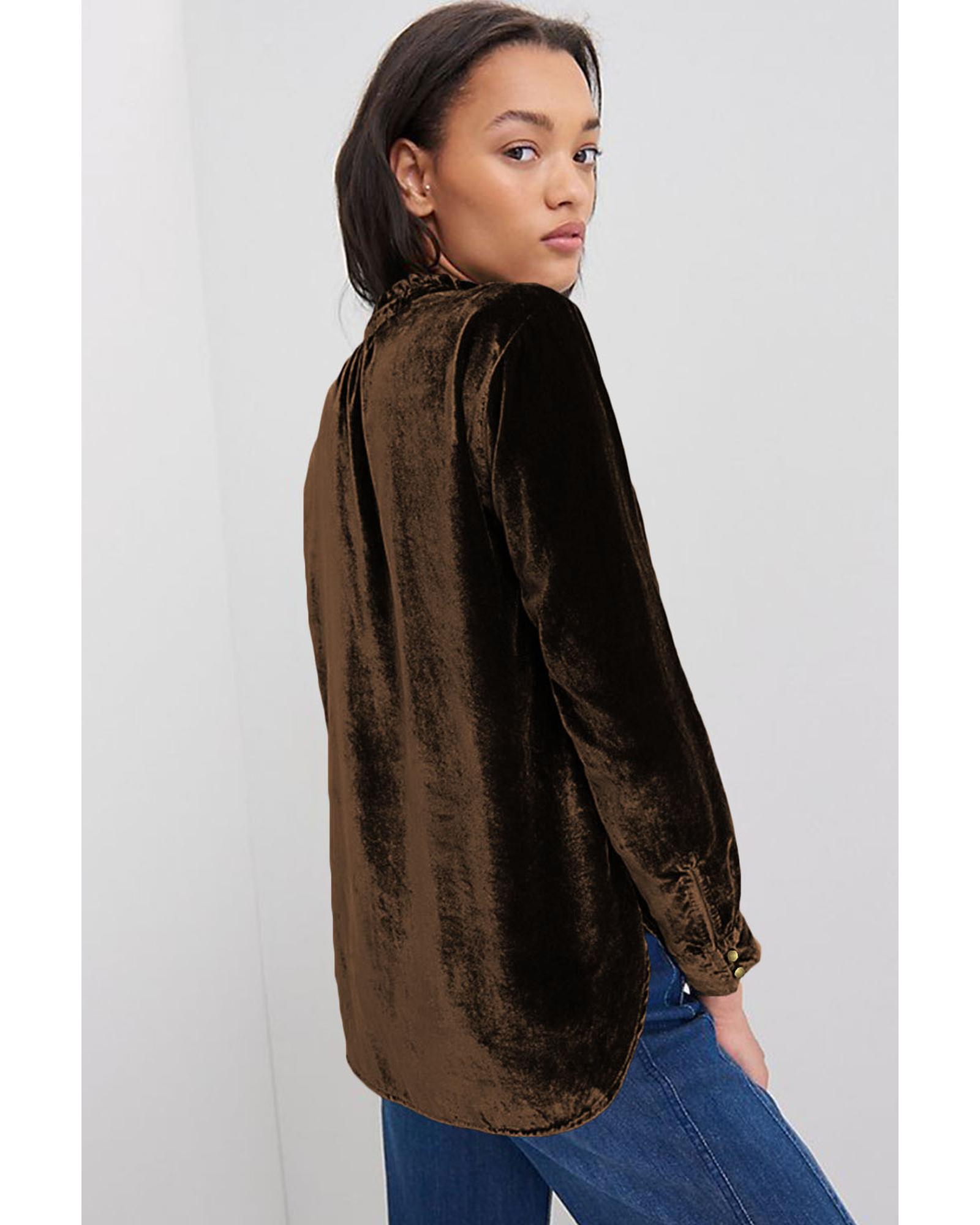 Desert Palm Frilled Neck Buttoned Front Velvet Top – M