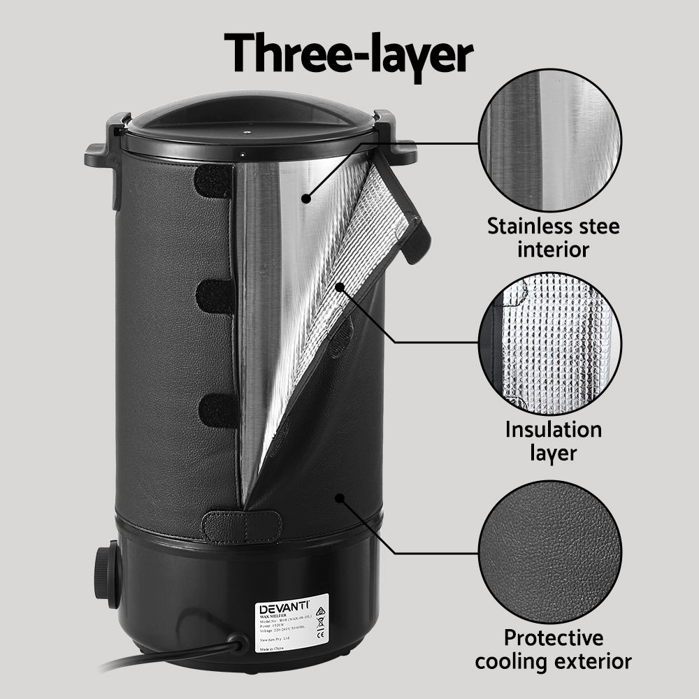 Introducing our Devanti Wax Melter, the ultimate fusion of safety and efficiency. With thermal safety shutoff and boil-dry protection, it guarantees worry-free melting. Triple-layer insulation ensures rapid heating and prolonged warmth. Effortlessly pour wax with the specially designed spout. Simplify your melting experience with precise temperature control.