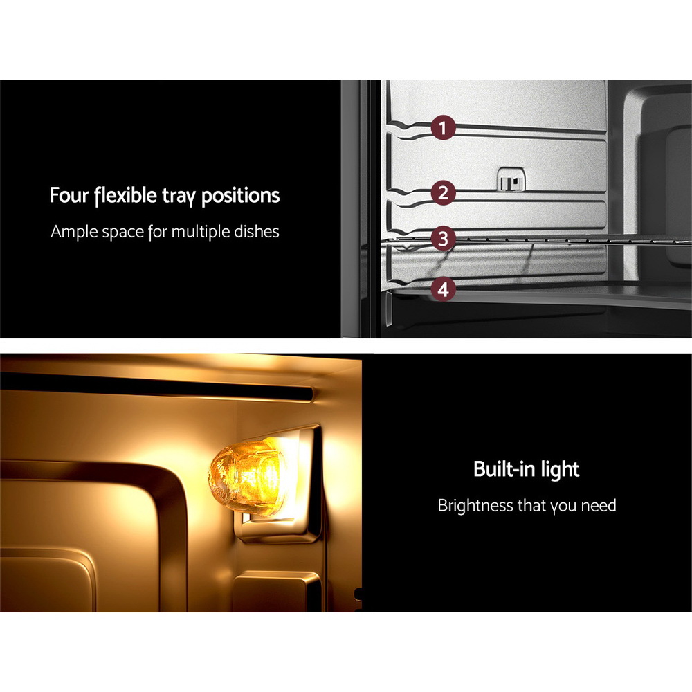 Need a multi-functional oven that you can take anywhere? Or do you need a solution for a home without an existing oven? Look no further than the Devanti Convection Oven. Portable and easy to use, the 60L capacity oven can bake, grill and roast to create your favourite recipes with minimum hassle. The oven is well insulated and has a cool-touch handle to always keep heat and radiation at bay for comfortable cooking. It features a rotisserie option for even cooking, 4 flexible tray positions and your choice of heating element options for precise cooking control every time. With its tempered glass door and built-in light, you can always monitor the progress of your cooking and adjust the temperature as needed. It also has a 60-minute timer with an alarm to help you time your cooking to perfection. Not least, the oven also comes with a host of bonus accessories that include a non-stick baking tray, wire rack, tray handle, rotisserie fork and rack, so you’ll have everything you need to start cooking pronto!