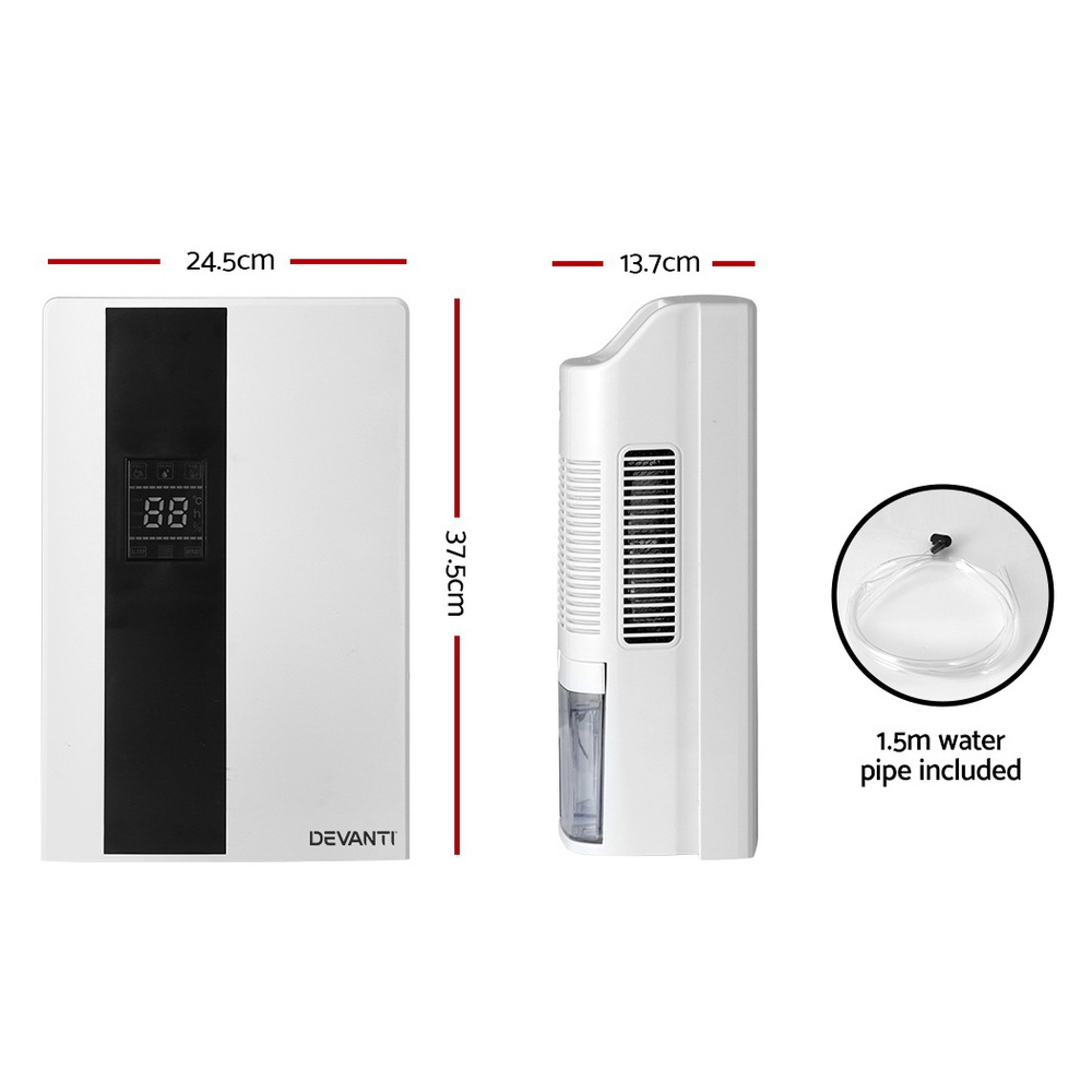Do you have recurring moisture issues in your home, like mould growth or heavy condensation? Or are you just looking for something to clear the air? Then you need the Devanti Dehumidifier for your home. Many home pests love moist and dark environments, but our dehumidifier will pull water out of the air to reduce damaging moisture in your surroundings, preventing mould, dust mite and mildew growth in your furniture and clothes. Tired of drying clothes indoors? Use the dehumidifier to speed things along – helps to dry clothes faster without using a dryer. The photocatalyst filter removes bacteria and allergens from the air, making the machine a 2-in-1 dehumidifier and air purifier. Control from anywhere inside the home with the included Smart Controller and set timers for up to 24 hours for automatic peace of mind. The dehumidifier operates whisper quiet, so you won’t need to worry about interrupted sleep or household activities. Select from two draining options: The 2L removable water tank with full tank indicator, or continuous drainage with the included 1.5m water pipe. Other great features include an auto-defrost mode for proper machine maintenance, two convenient handles for portability and 30㎡ coverage to suit both small and larger rooms. Turn your home from damp to delightful with a Devanti Dehumidifier.