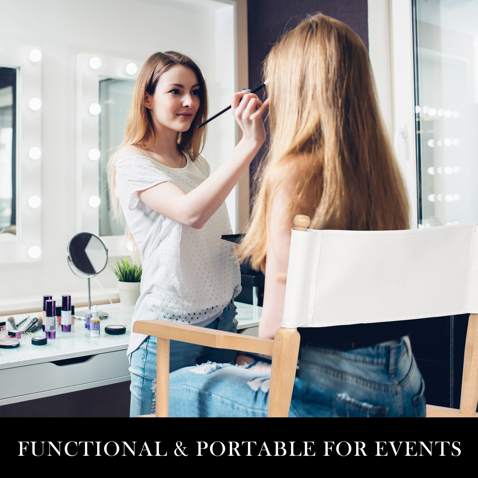 Besides, there are two detachable side bags and large storage for your beverages or work essentials. It is really ideal for makeup! And when it’s a wrap, just fold the lightweight Chair away for easy transport or storage.