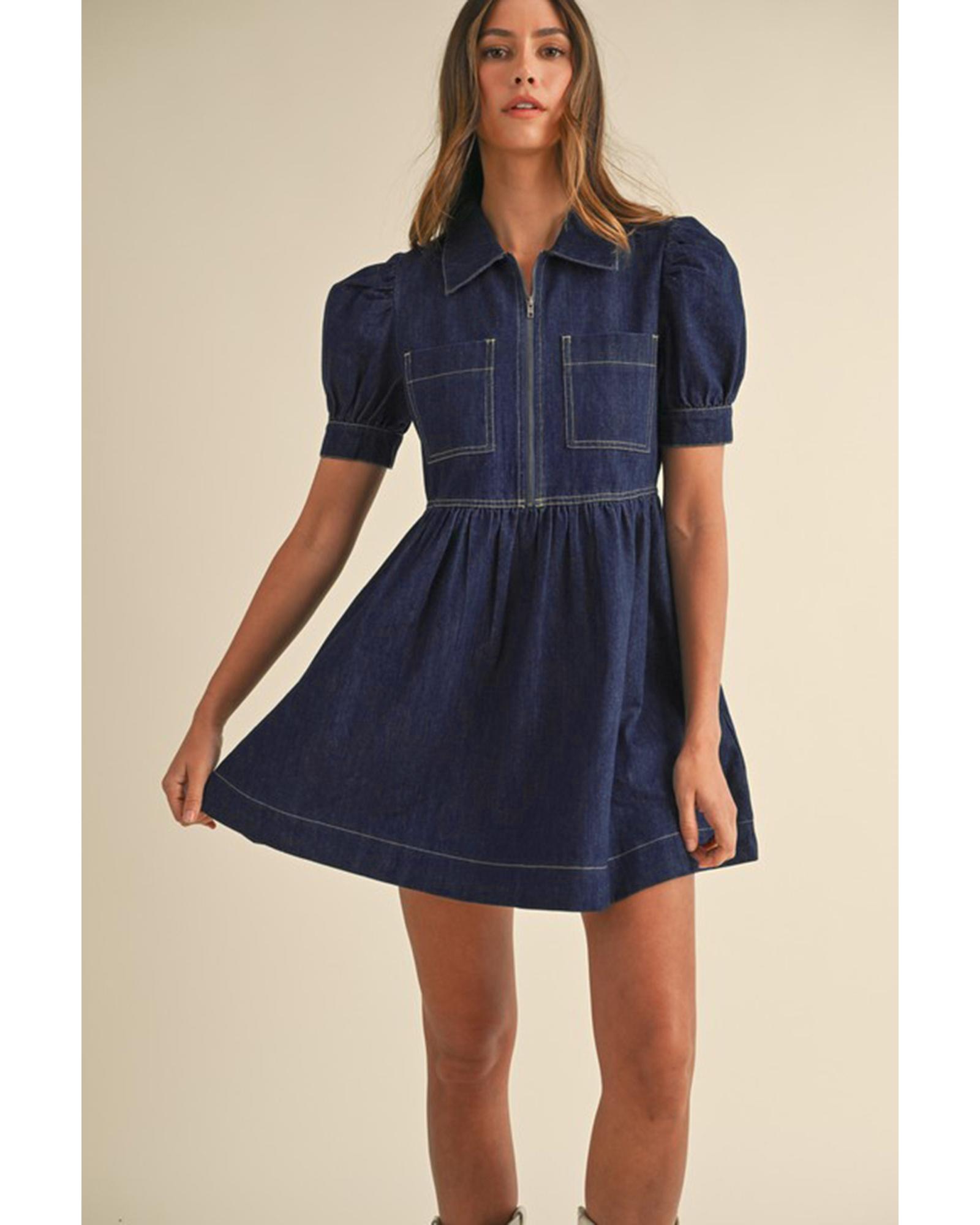 Dirty blue Zipped up Bodice Collared Short Puff Sleeve Denim Dress – L