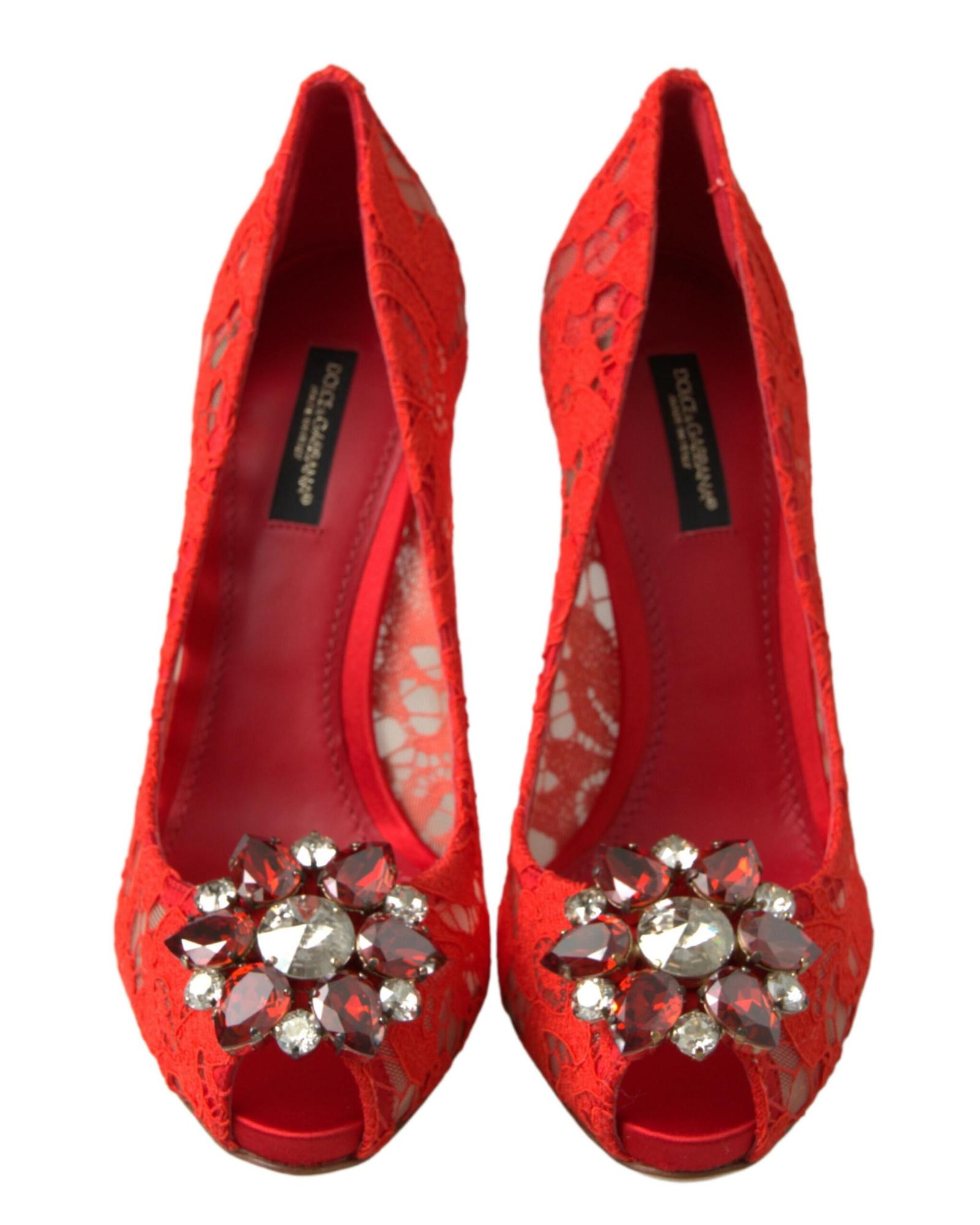 Dolce & Gabbana Women's Red Taormina Lace Crystal Heels Pumps Shoes - 37.5 EU