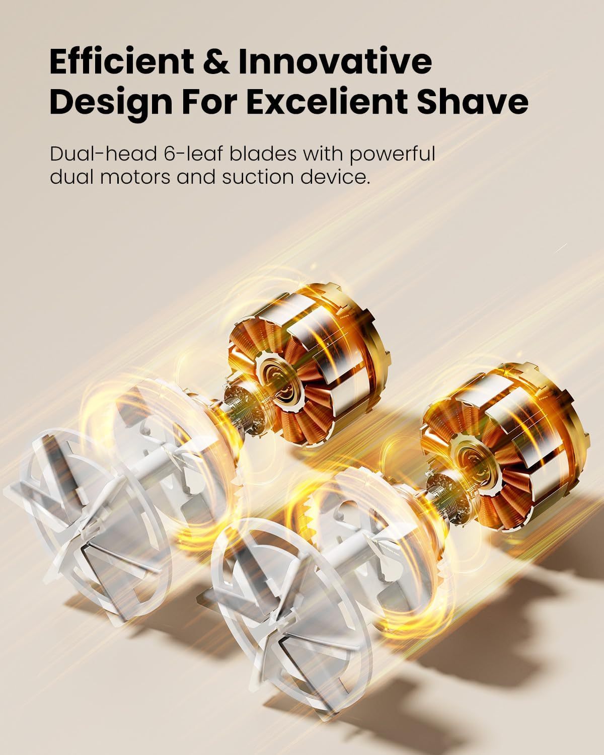 - Design: Dual-Head, Dual Motor, Dual 6-Leaf Blades