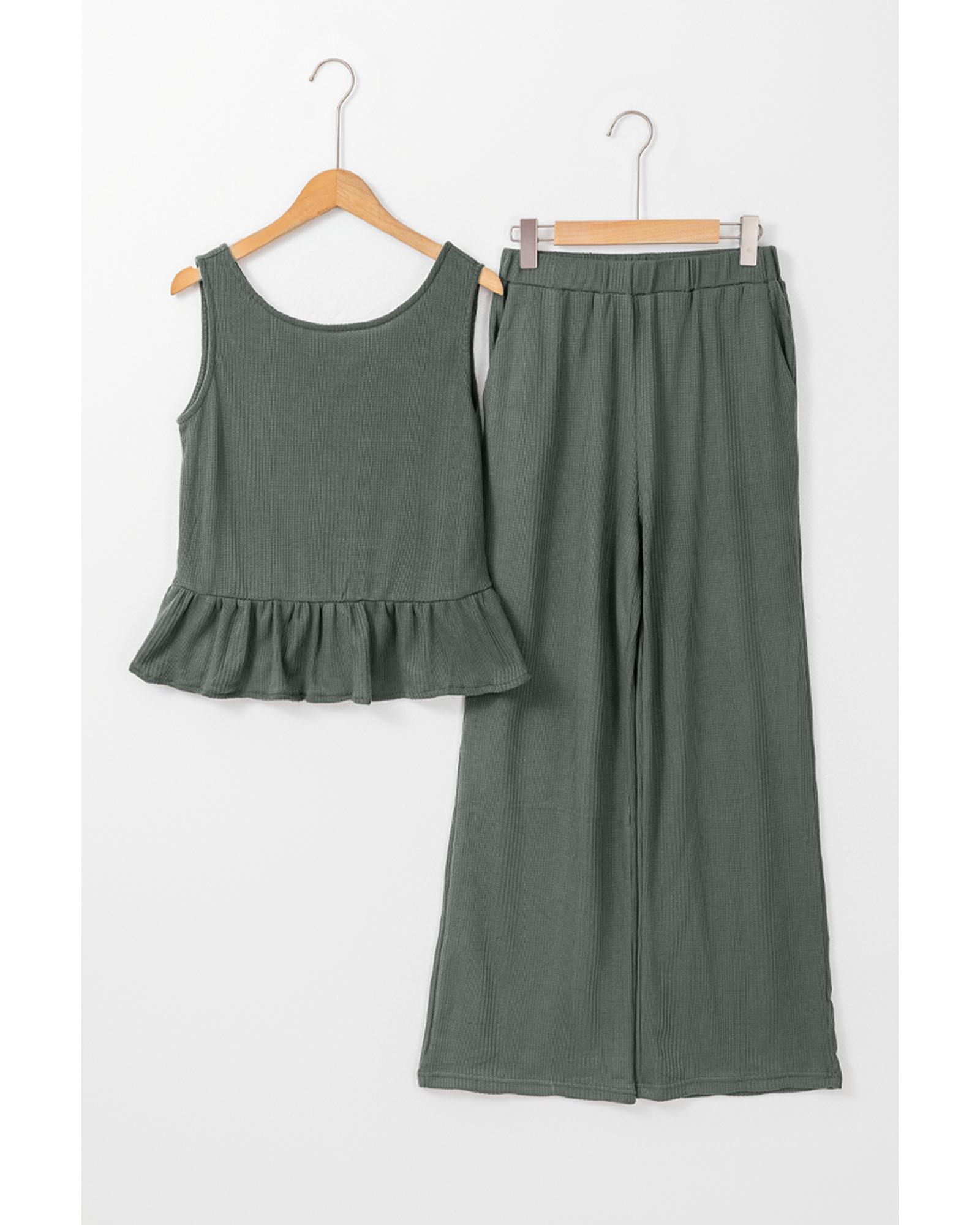 Duffel Green Solid Color Ribbed Ruffle Tank Top and Pants Set – M