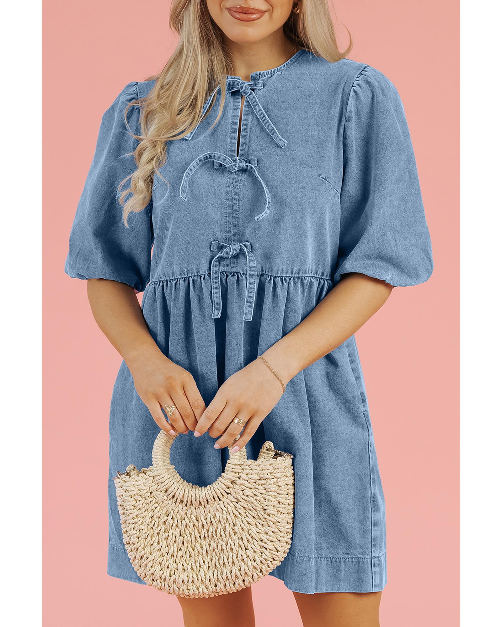 - Dusk Blue Bowknot Bubble Sleeve Short Denim Dress