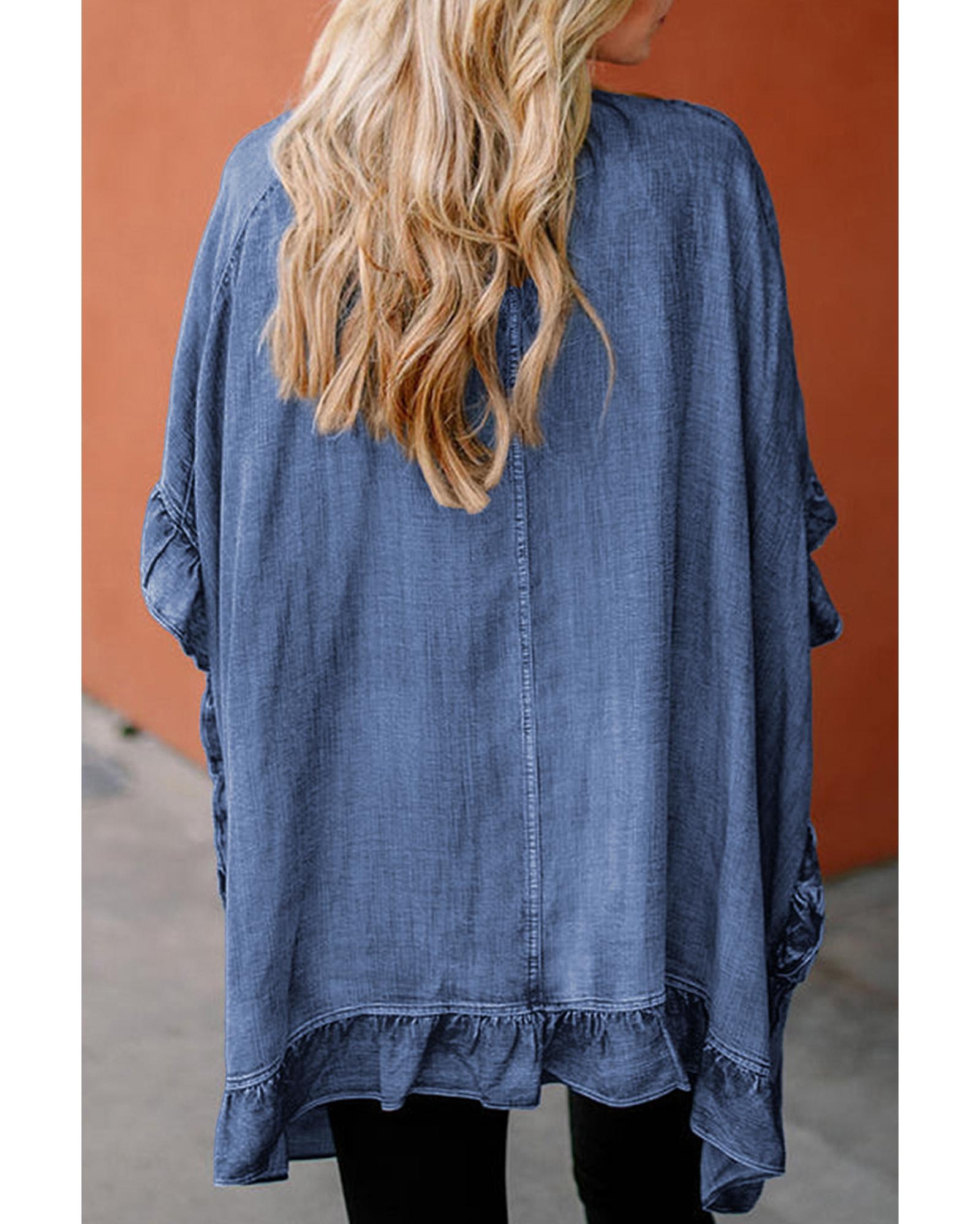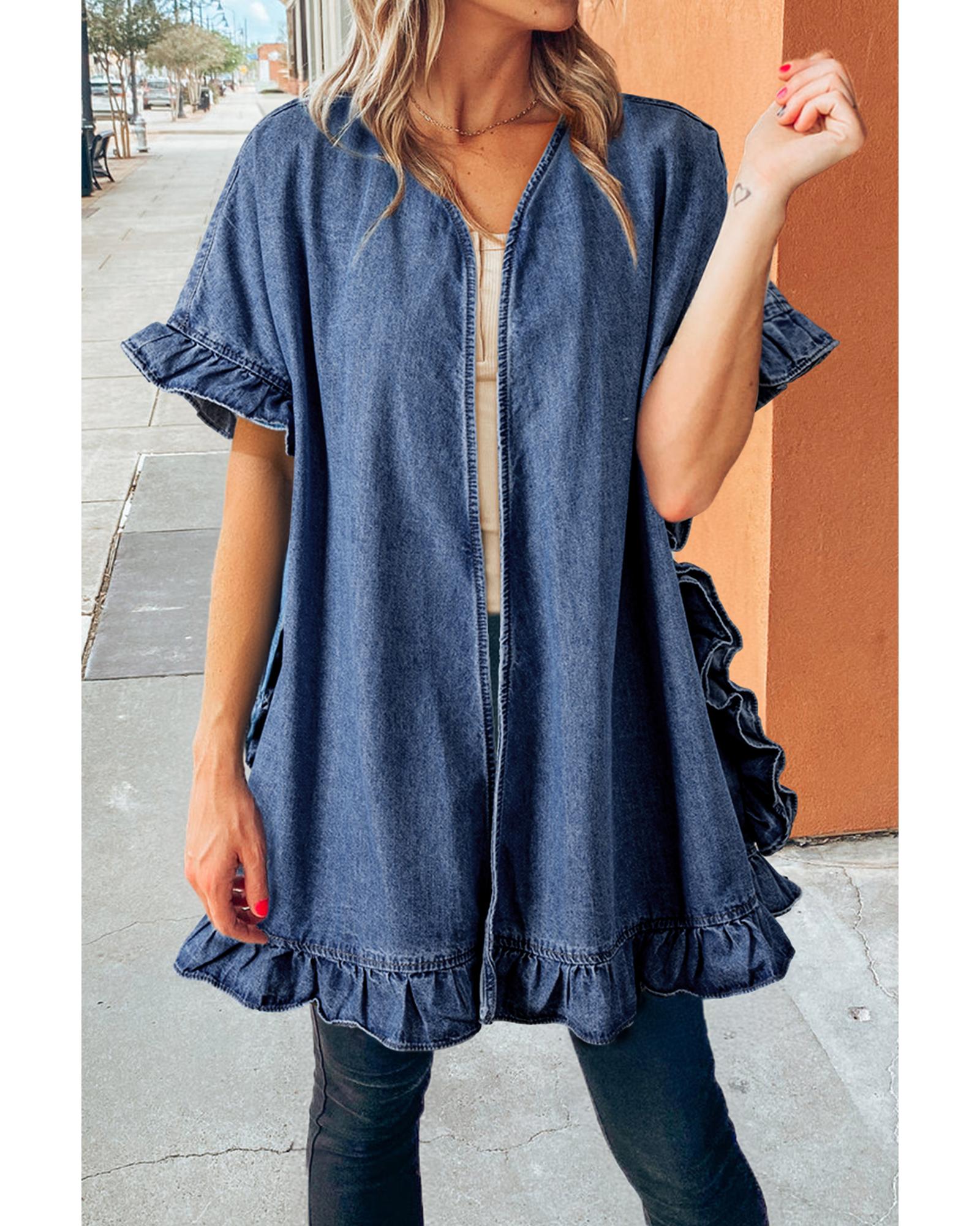 Dusk Blue Chambray Ruffle Hem Half Sleeve Open Loose Kimono – M