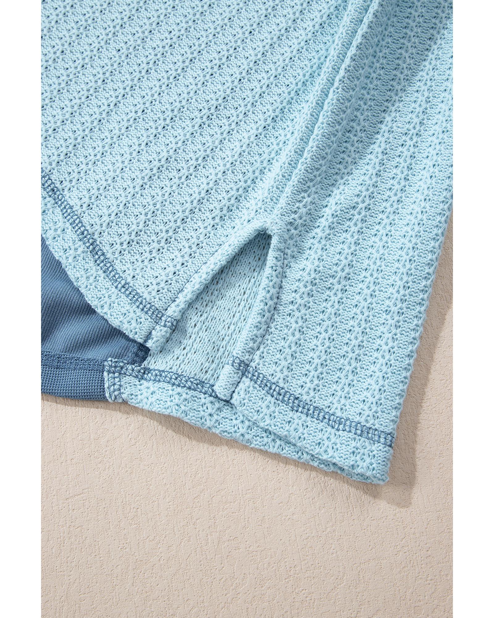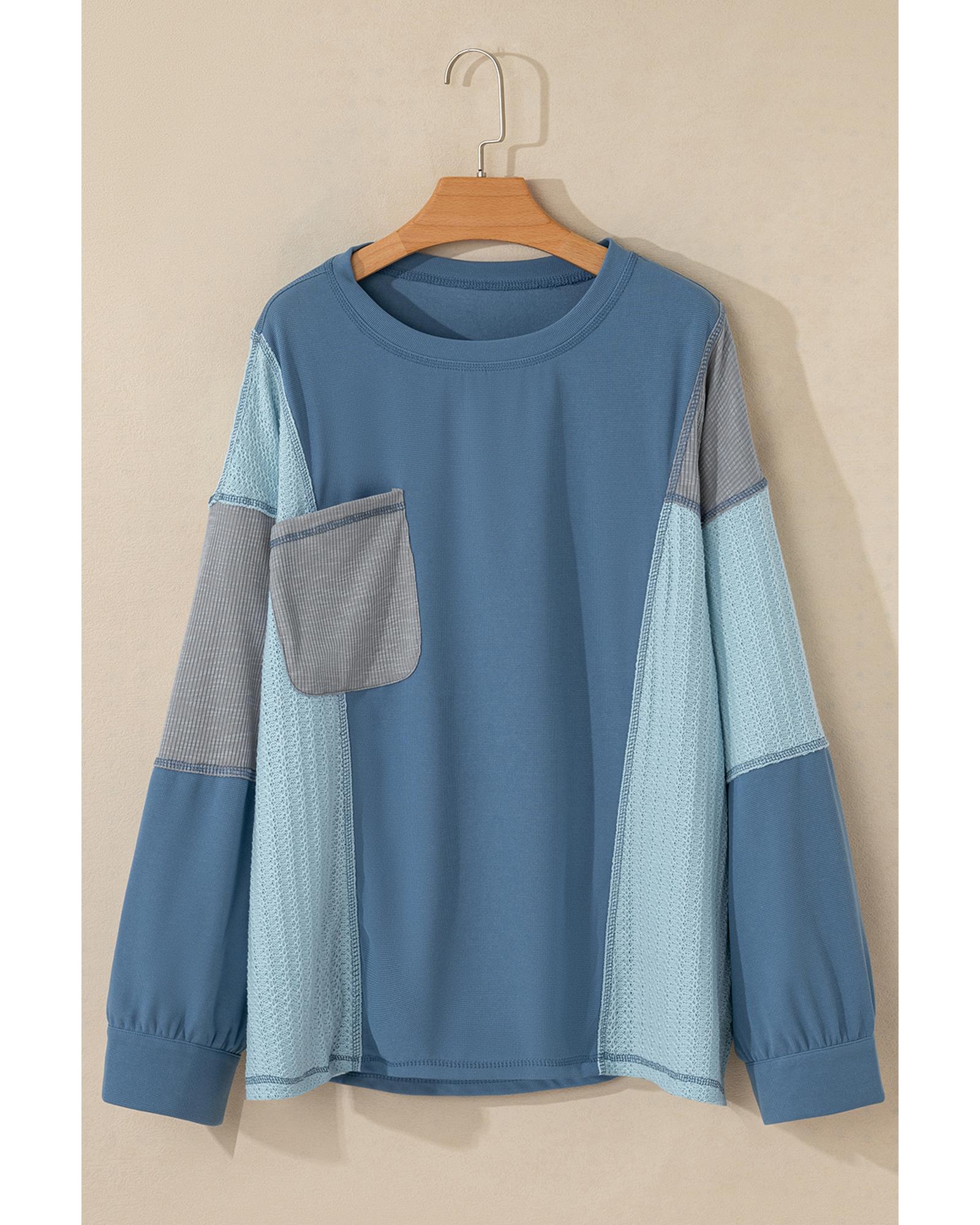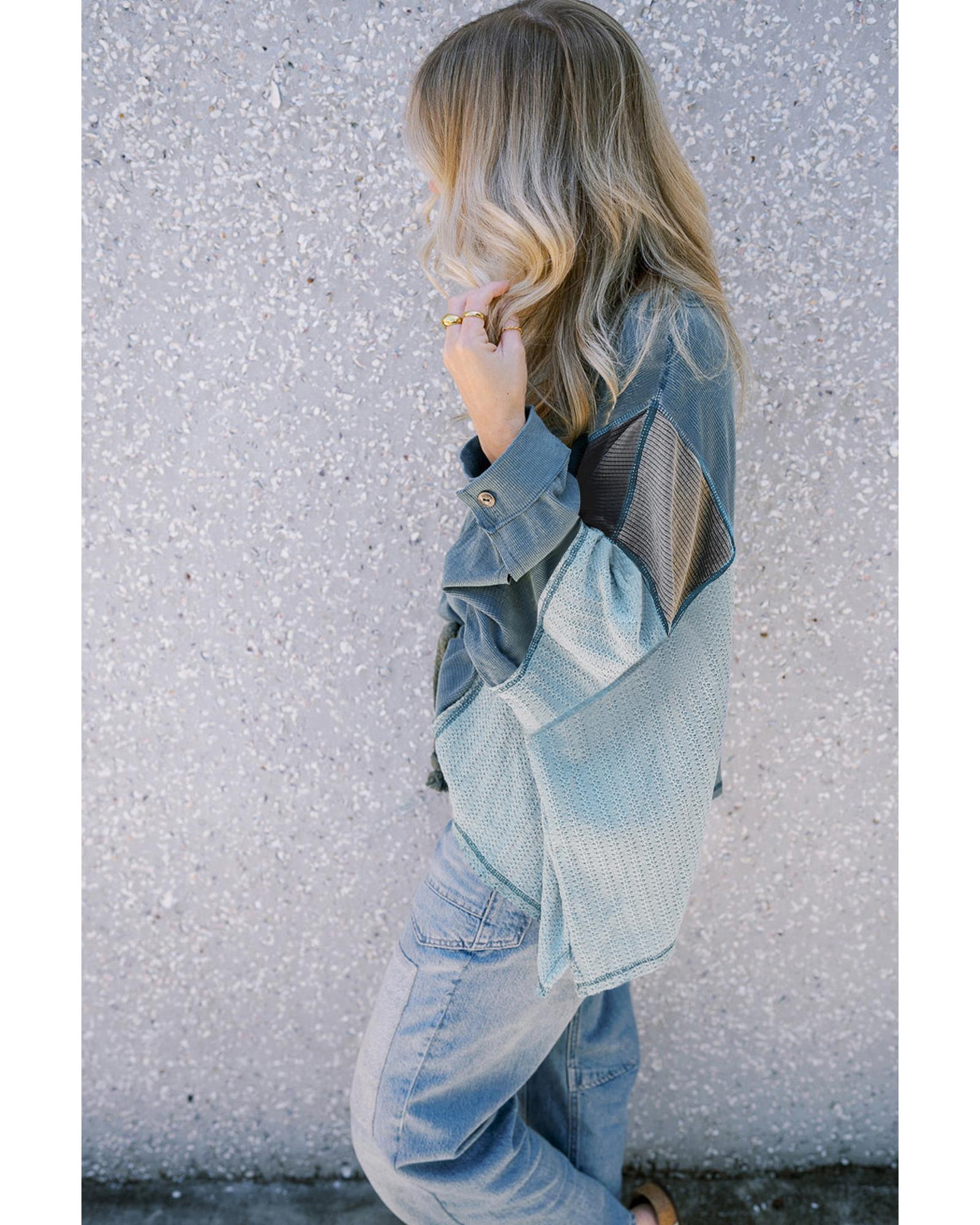 Dusk Blue Colorblock Stitching Patchwork Buttoned Long Sleeve Top – XL
