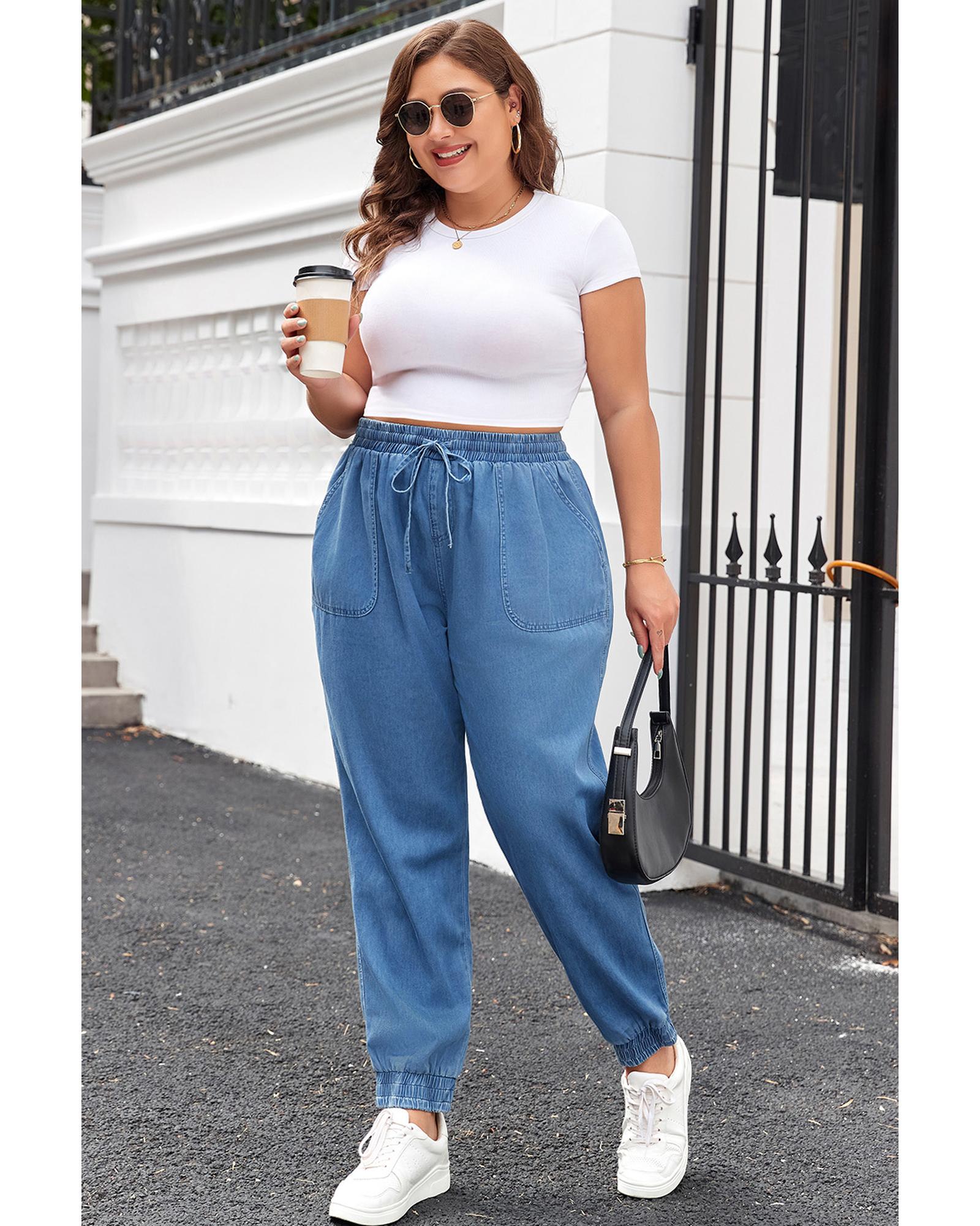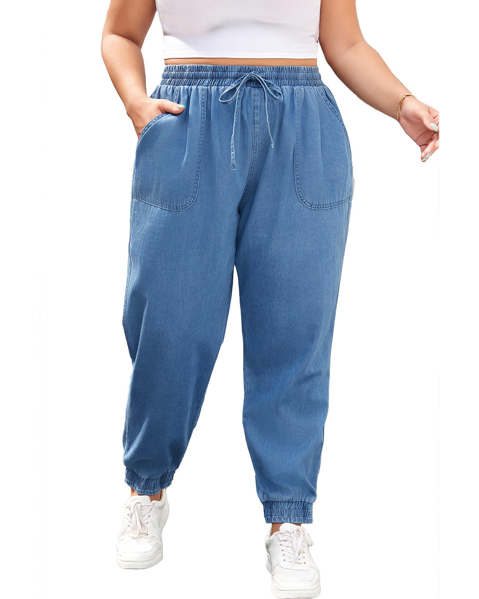 Dusk Blue Drawstring Waist Pocketed Plus Size Denim Joggers – 2X