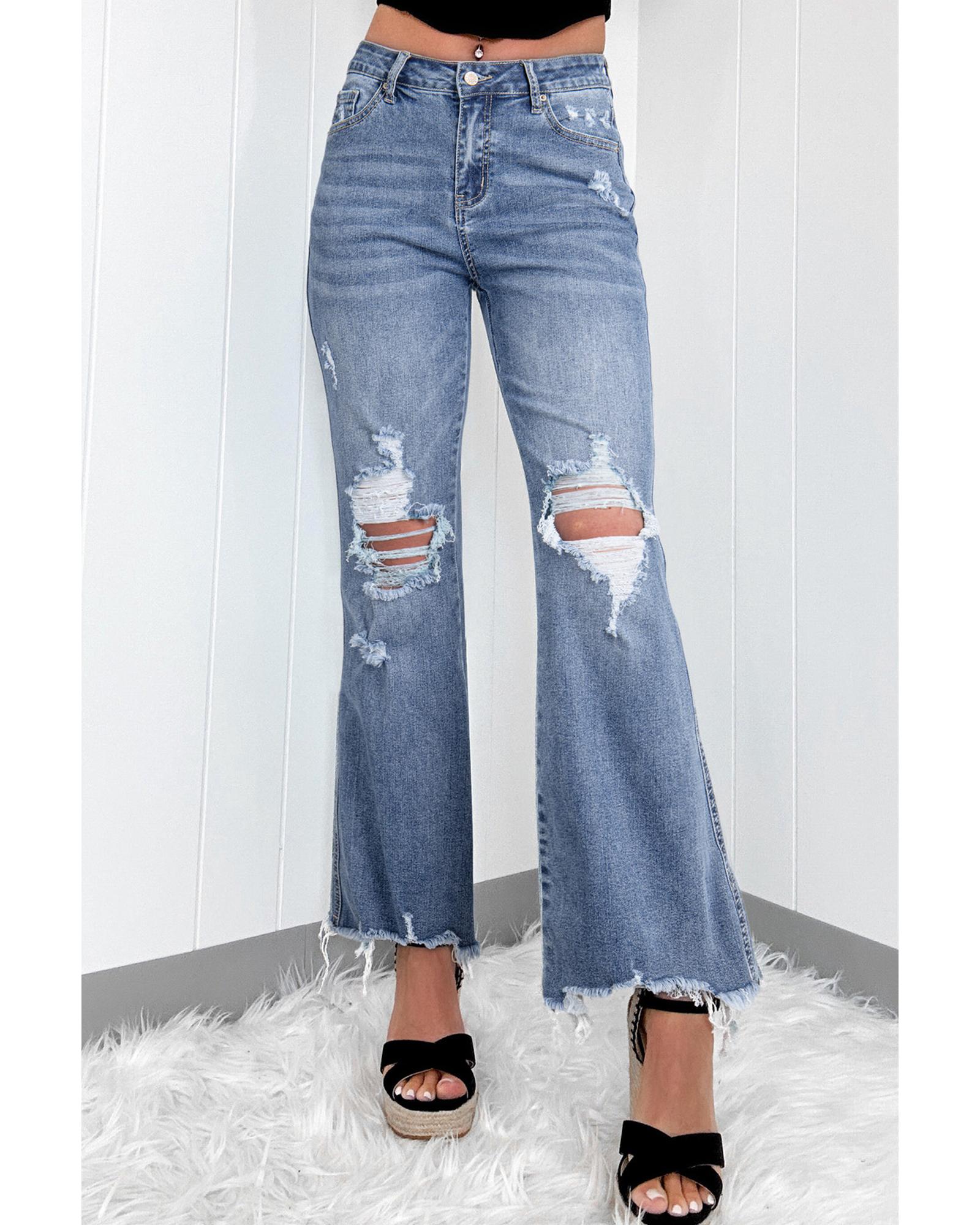 - Trendy distressed hem on flared legs