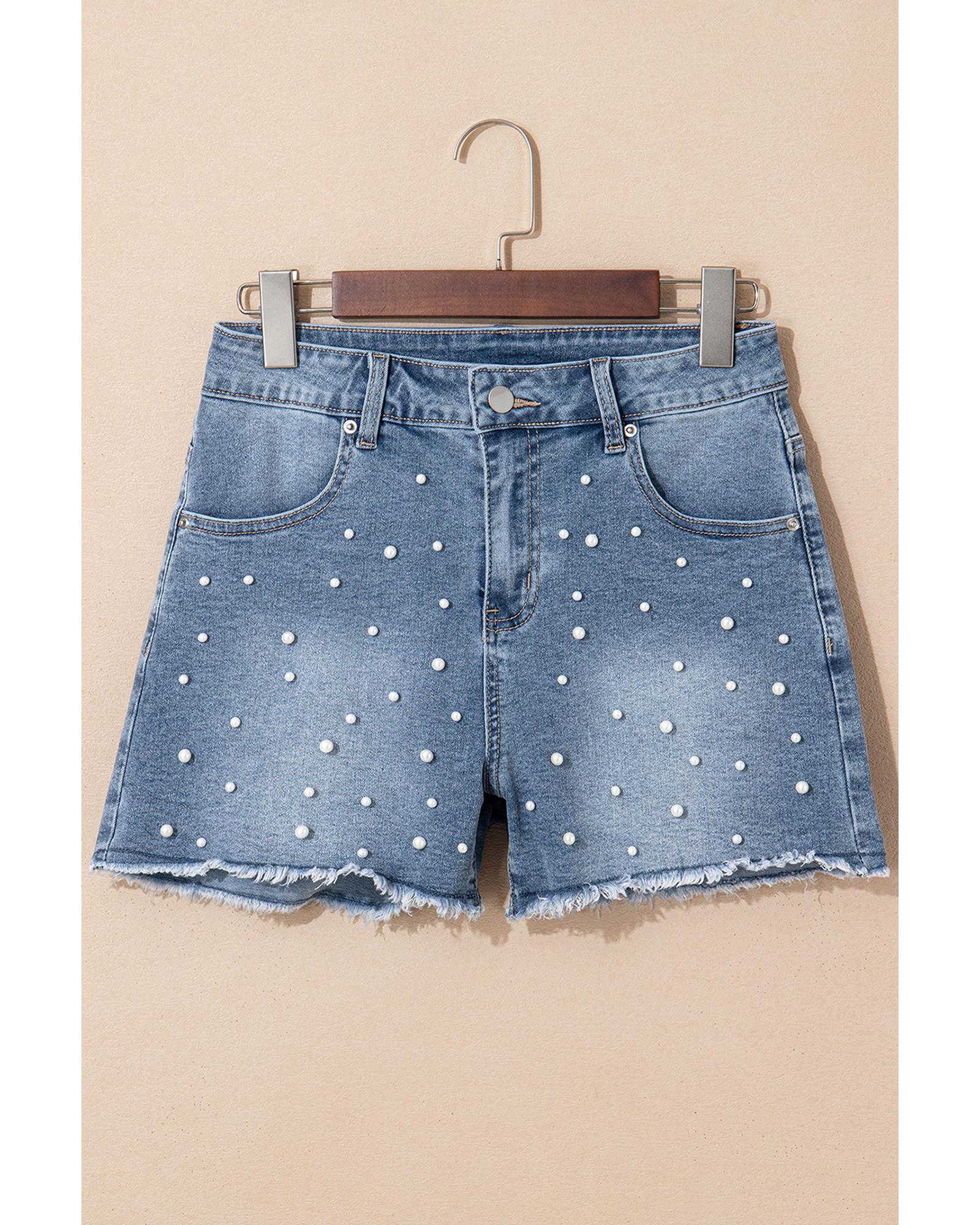 • Dusk Blue Pearl Beaded Raw Hem Medium Wash Denim Shorts