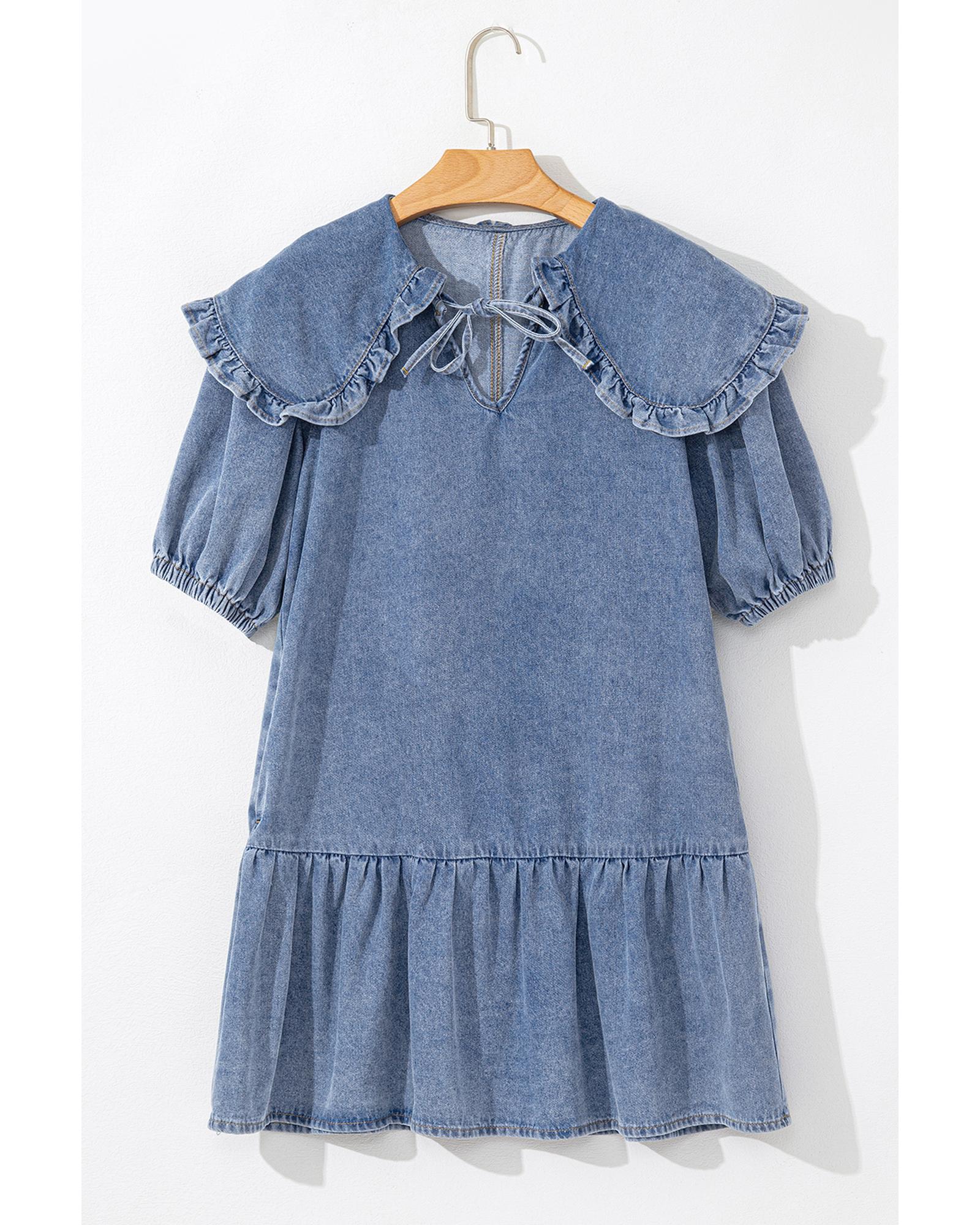 Dusk Blue Ruffled Collared Side Pockets Puff Sleeve Denim Mini Dress – S