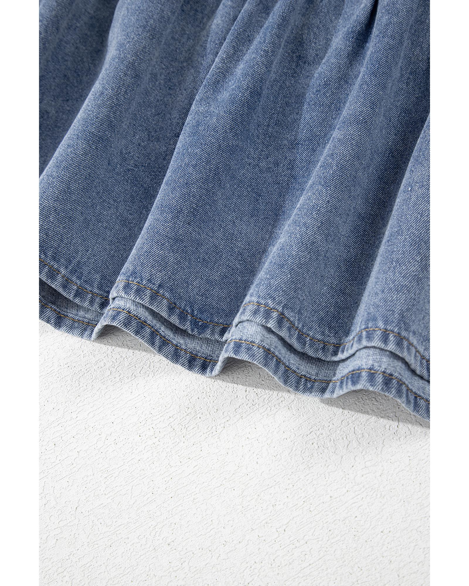 Dusk Blue Ruffled Collared Side Pockets Puff Sleeve Denim Mini Dress - M