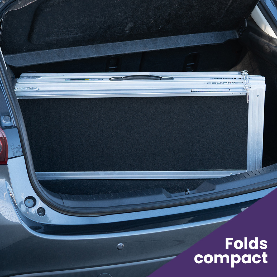 Equipmed ramps are expertly machine welded with non-slip serrated slats and side rails for peace of mind. The ramp only weighs 10kg and folds to a compact 38 x 62cm size for easy storage, and comes with 2 x locking pins that keep it together when being carried.