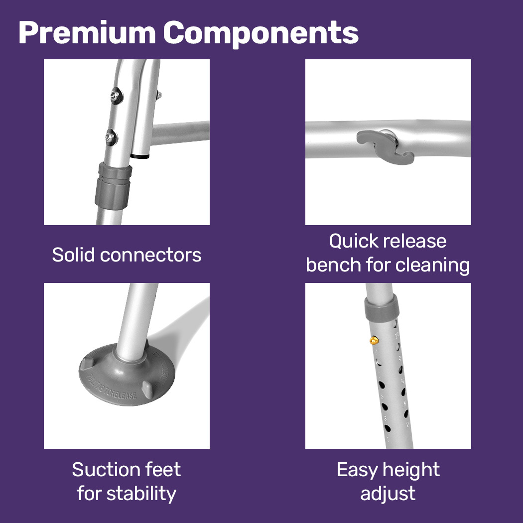 Introducing the Equipmed Bath Transfer Bench – your ultimate bathroom seating assistance. Whether you require assistance getting into and out of the bath or shower, transferring from an Equipmed mobility aid, or caring for a loved one this lightweight, ergonomic, and user-friendly design ensures you or your loved one get the support they need.