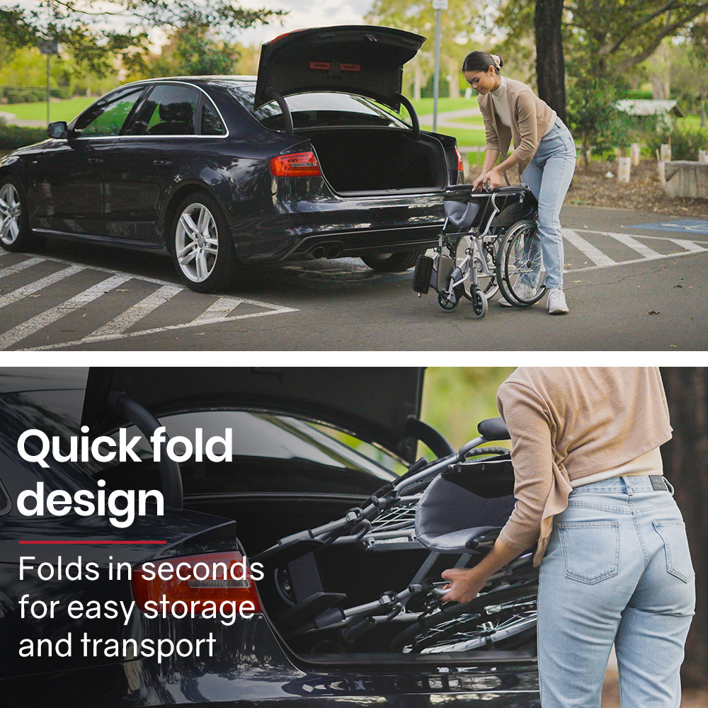 This premium lightweight wheelchair features fold up footrests allowing for access onto the wheelchair. The comfy padded seat and generously proportioned backrest ensure a comfortable ride. And, thanks to the 2 second folding action and ergonomic handles, it makes for a relaxing day out for any helpers, too! They can activate the easy access dual brakes to safely go down hills and ramps, while dual parking brakes can lock the wheels into position a perfect time to pull out some reading material from the backrest pouch!
