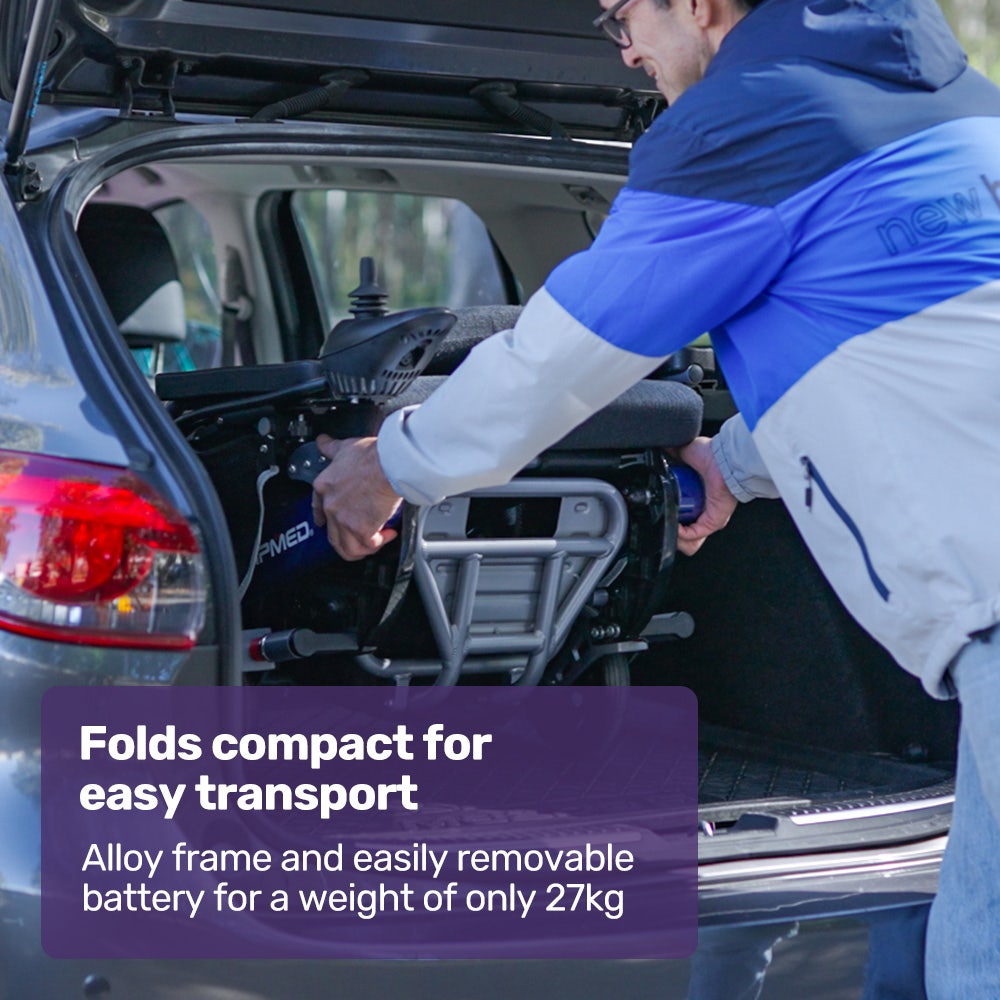 The Equipmed motorised wheelchair is quick to fold. Plus, an alloy frame and easy-to-remove lithium battery mean that it is as light as possible for loading into a car boot or moving into a space-saving storage position.