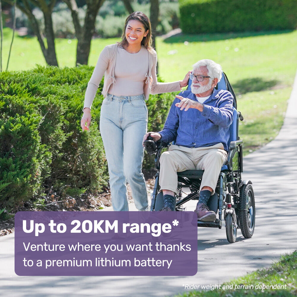 Riders of all shapes and sizes will appreciate the bariatric rated extra wide 52cm seat. Ride in pleasure thanks to the thick memory foam seat, backrest and headrest. The recline angle of the backrest is also adjustable to suit the rider’s preference. A comfortable front and rear suspension system soaks up the bumps.