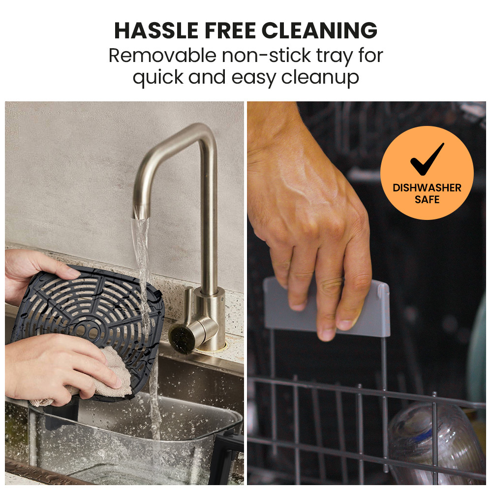 - Removable non-stick tray and dishwasher-safe components