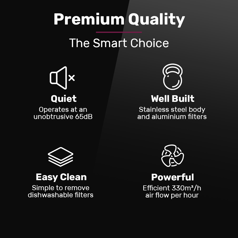Designed for quiet operation, it produces just 65dBa of sound at maximum speed. The easy-to-use auto-on switch with two-speed controls gives you flexible ventilation options, while the removable, dishwashable three-layer aluminium filters simplify maintenance.