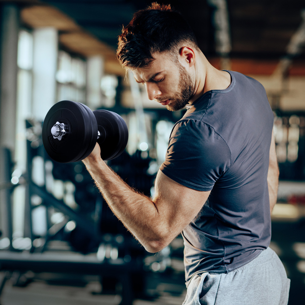 Time to get tough. If you are looking to boost those triceps, biceps and shoulders, our 25kg Dumbbell Set is the perfect deal for you. Whatever your game is, our dumbbell set lets you strengthen and tone those muscles your way. This commercial-grade set features a high-quality bar with non-slip handle that offers optimal gripping surface. Each weight plate weighs 2.5kg and is made of cast cement coated with smooth plastic, reducing clanging sounds and making them more floor-friendly. You can adjust the weight of the dumbbell by removing the weight plate and only using the dumbbell bar (weighing 2.5kg each) or adding more compatible weight plates. The star-shaped nuts ensure the weight plates stay securely in place for safe workouts. Best of all, the dumbbell comes in a set of two (two 12.5kg dumbbells for 25kg total) so that you can exercise both arms at the same time. Gym junkie or workout pro, you can get fit easily with our 25kg Dumbbell Set.