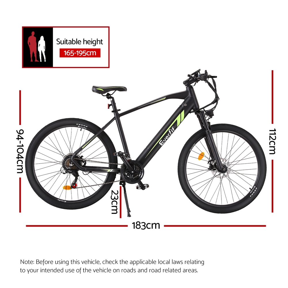 frame bike is easy to assemble, water-resistant, and perfect for mountain biking or exploring urban roads. The powerful 250W motor is paired with SHIMANO 21-speed gears and derailleur, making any terrain easy to tackle. With a 36V 10.4Ah removable rechargeable Li-ion battery, enjoy speeds up to 25km/h and a range of up to 60km on a single charge. Stay informed with the smart LED display panel and travel comfortably with the suspension front fork, height-adjustable saddle, and front and rear disc brakes. Our electric bike even comes with a built-in headlight and reflector for safe riding, while the durable wheels and tyres provide a smooth ride on a wide range of terrains. Suitable for riders with heights between 165-195cm and a weight capacity of 150kg. Charge time is between 6-8 hours. Get your electric mountain bike today for an unforgettable ride.