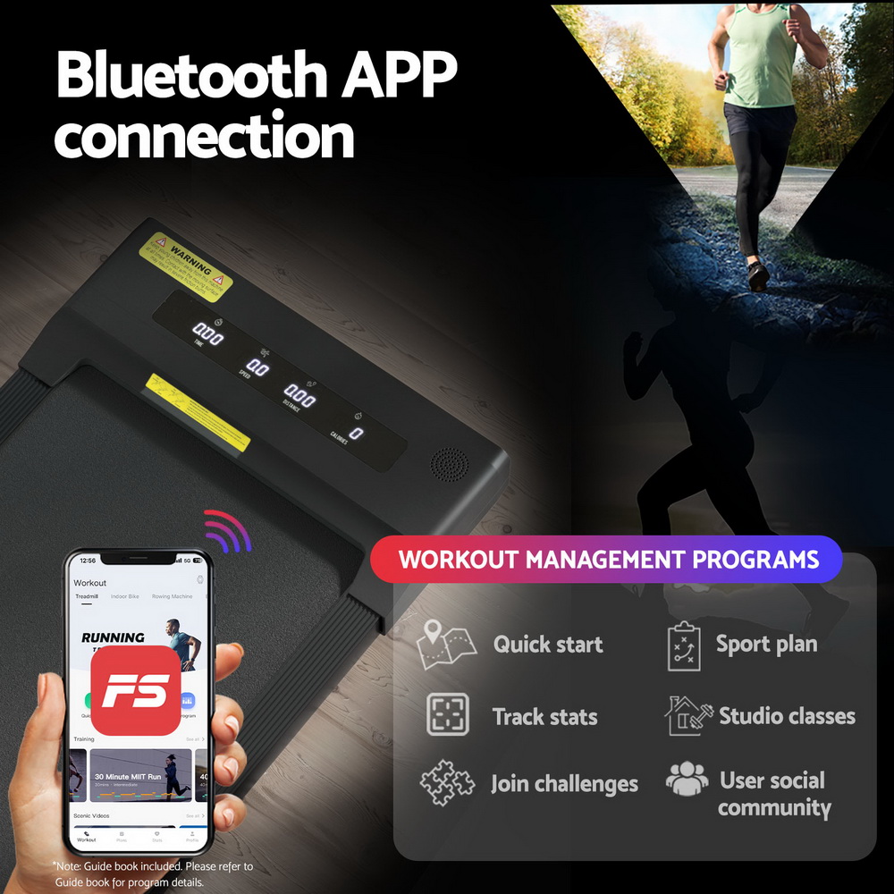 For a truly effective approach to weight loss and toning, our Everfit Walking Pad is your perfect companion. Compact and sturdy, the walking pad allows you to perform essential cardio exercises within the comfort of your home. It is foldable, easy to move, and comes ready to hit the ground running no assembly required. Controlled by either the companion app or remote control, set up speeds of between 1km/h and 10km/h and monitor speed, time, distance and calories. Its powerful and energy-efficient motor produces smooth and seamless operation and the anti-slip belt phone holder makes your session a comfortable and controlled experience. The 400mm non-slip running belt uses an enhanced shock control system to help reduce the risk of joint injury, making the walking pad suitable for adults and seniors. When all the hard work is done, easily fold the compact walking pad and store away. Other great features include smooth wheels for easy mobility and Bluetooth speakers for entertainment while exercising. For health results that matter, our fitness walking pad is the one to run to.