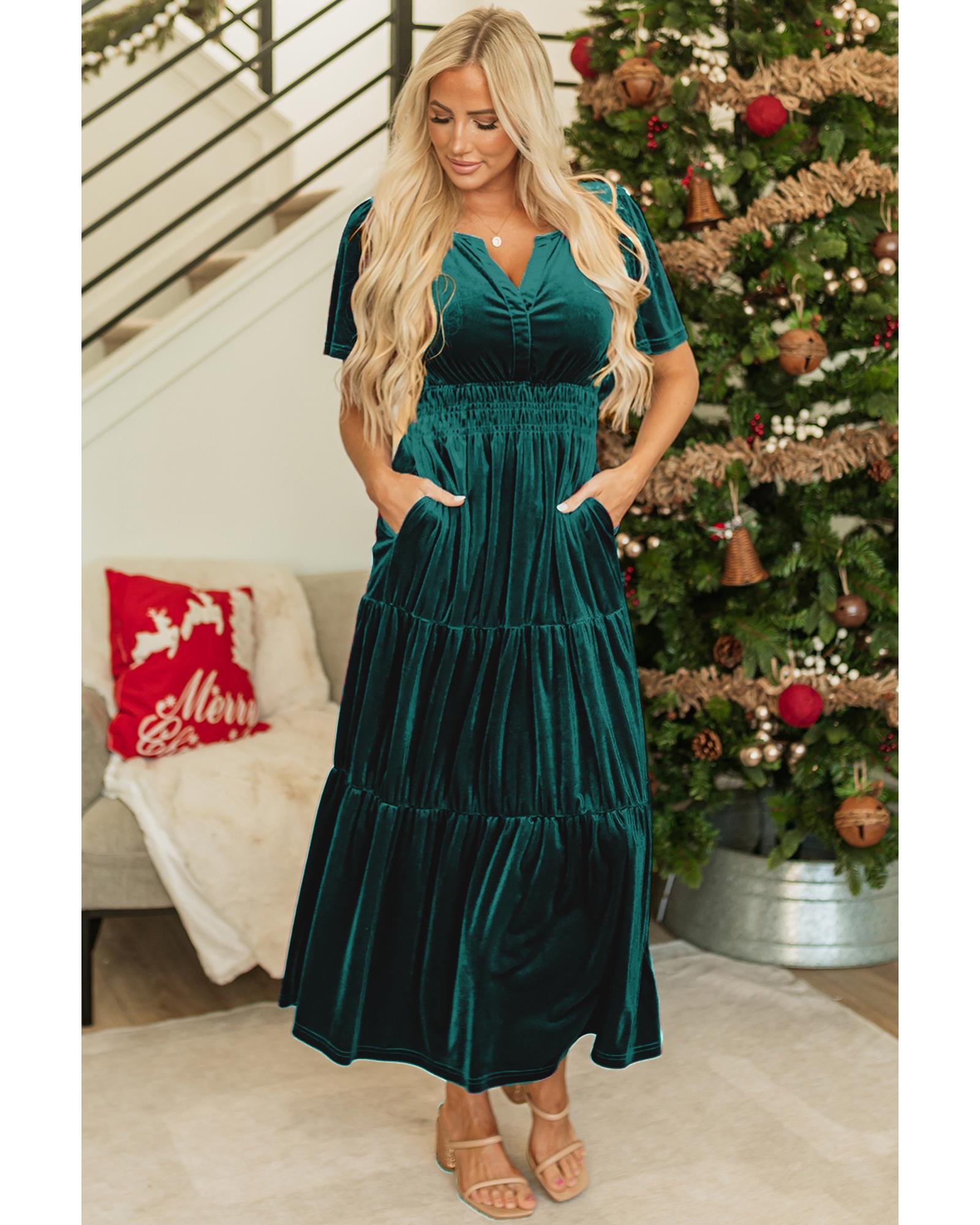 - Evergreen velvet short sleeve shirred waist tiered maxi dress