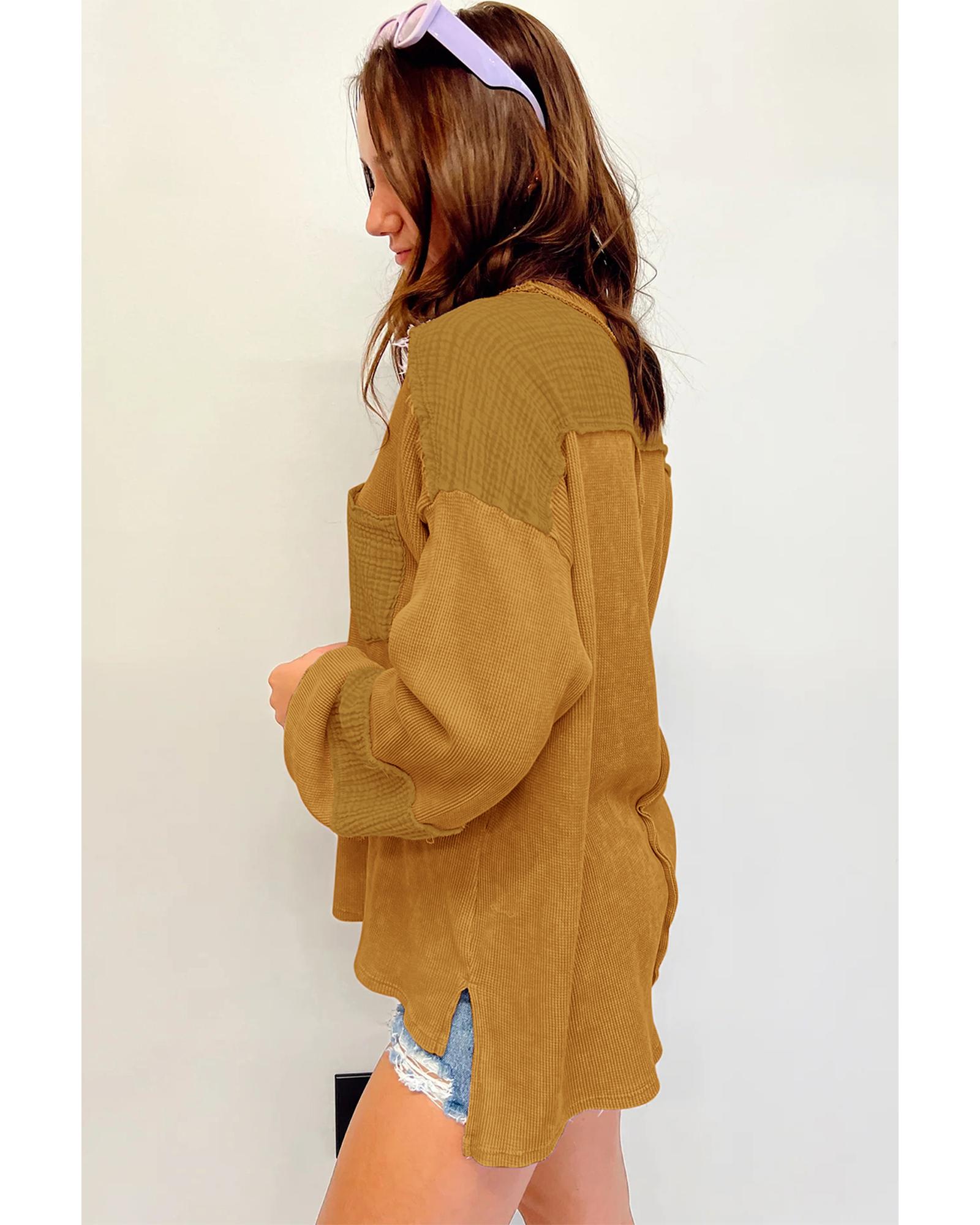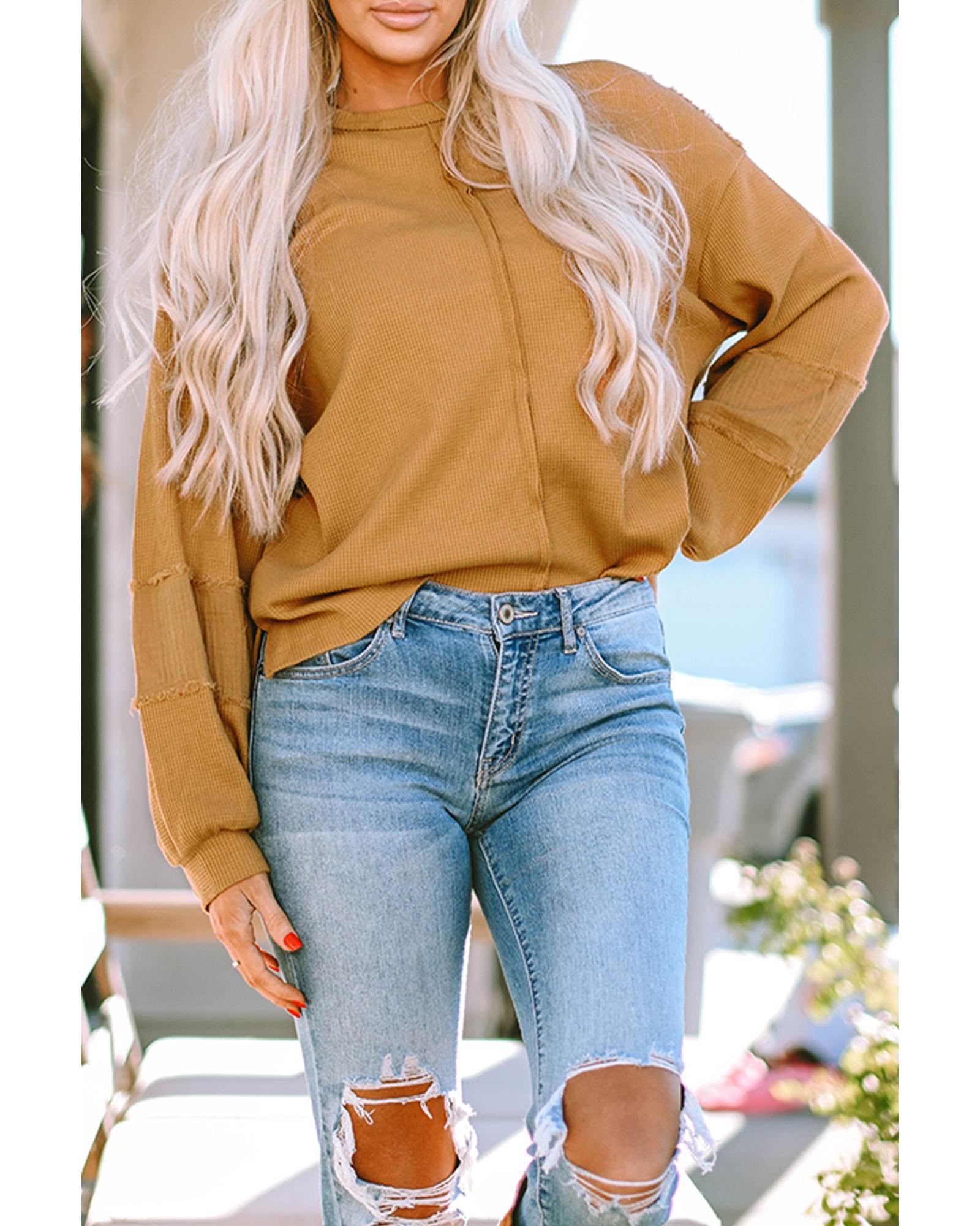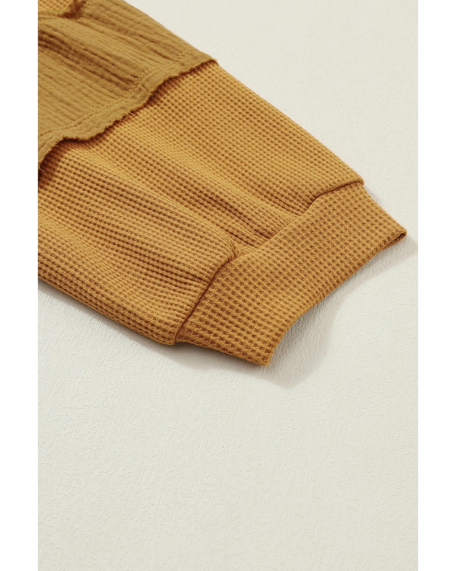 Exposed Seam Patchwork Bubble Sleeve Waffle Knit Top – M
