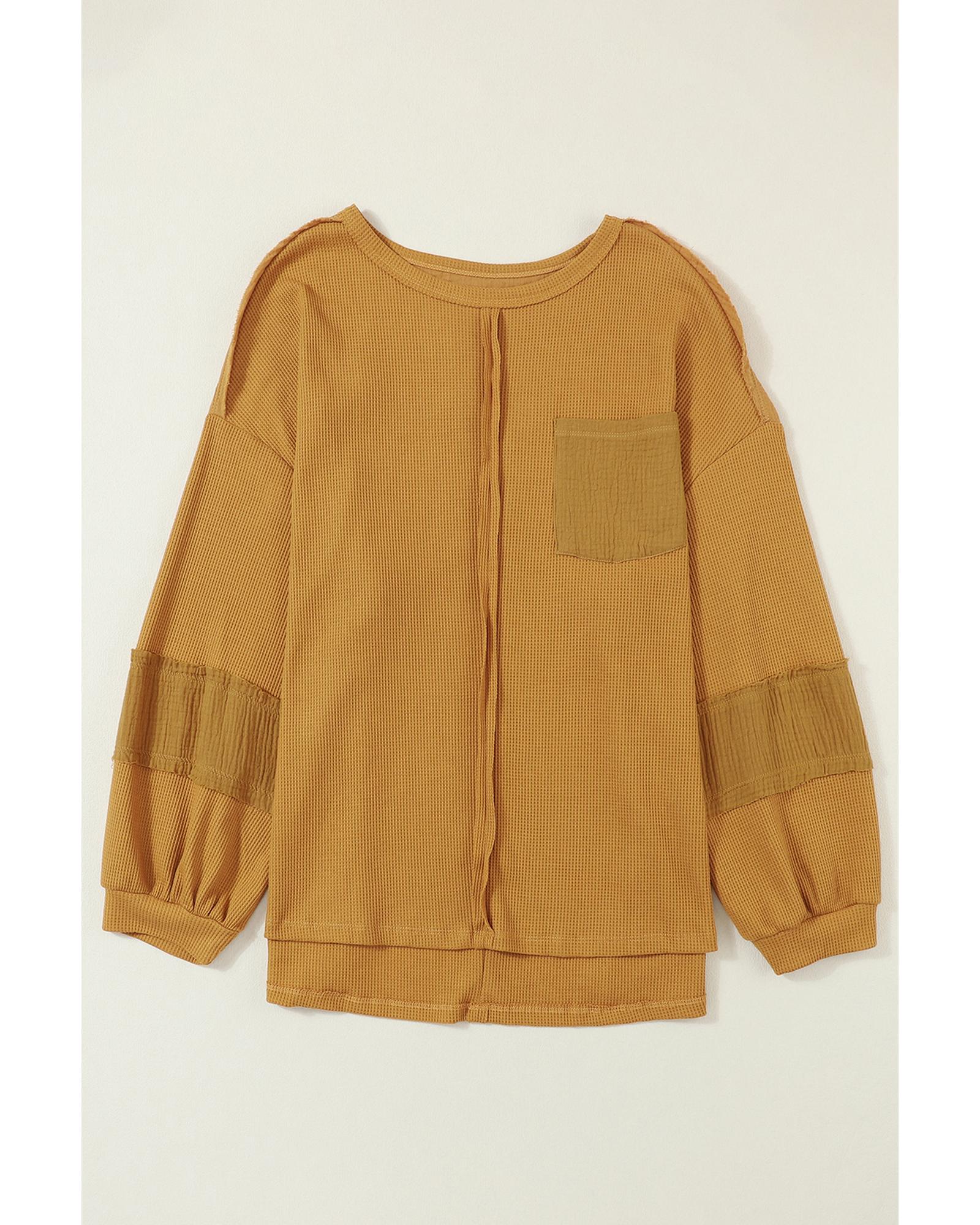 Exposed Seam Patchwork Bubble Sleeve Waffle Knit Top – S