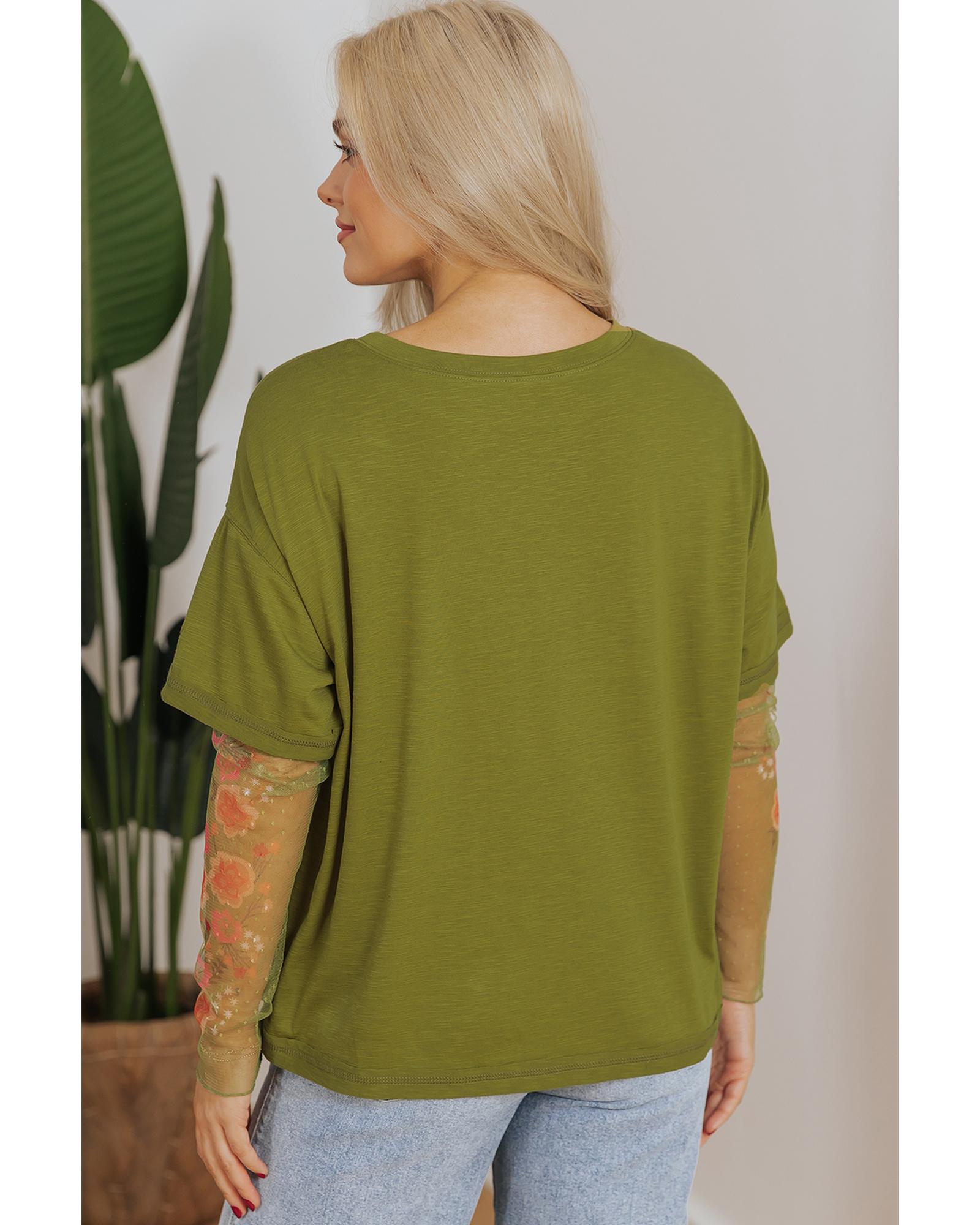 - Fern Green Faux Two Piece Floral Long Sleeve Patchwork Tee
