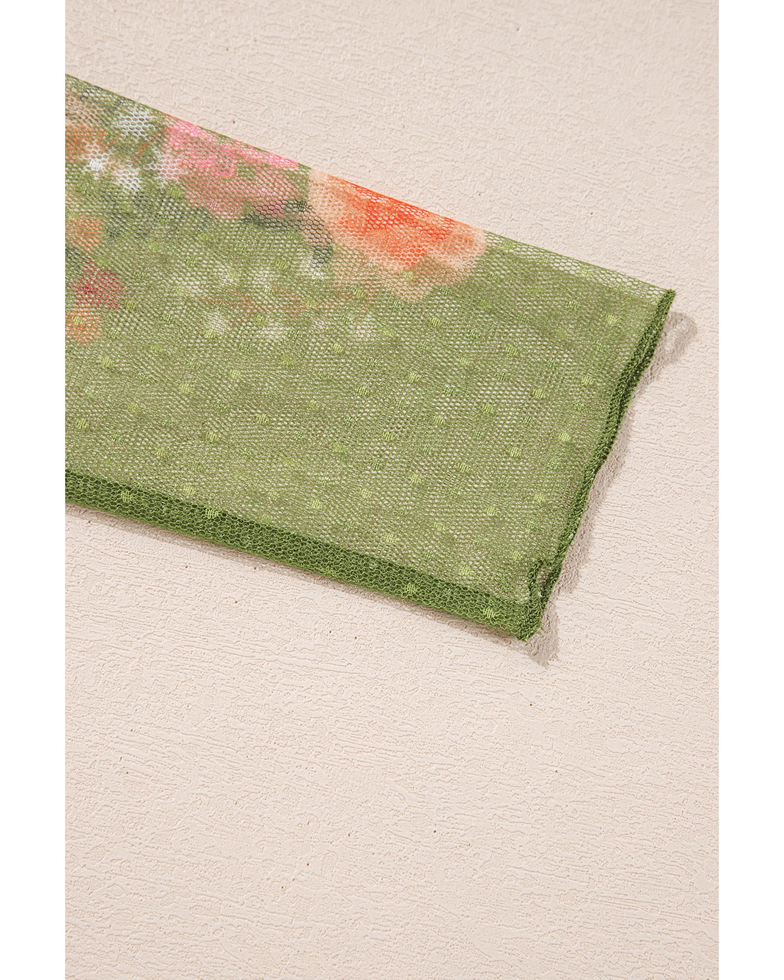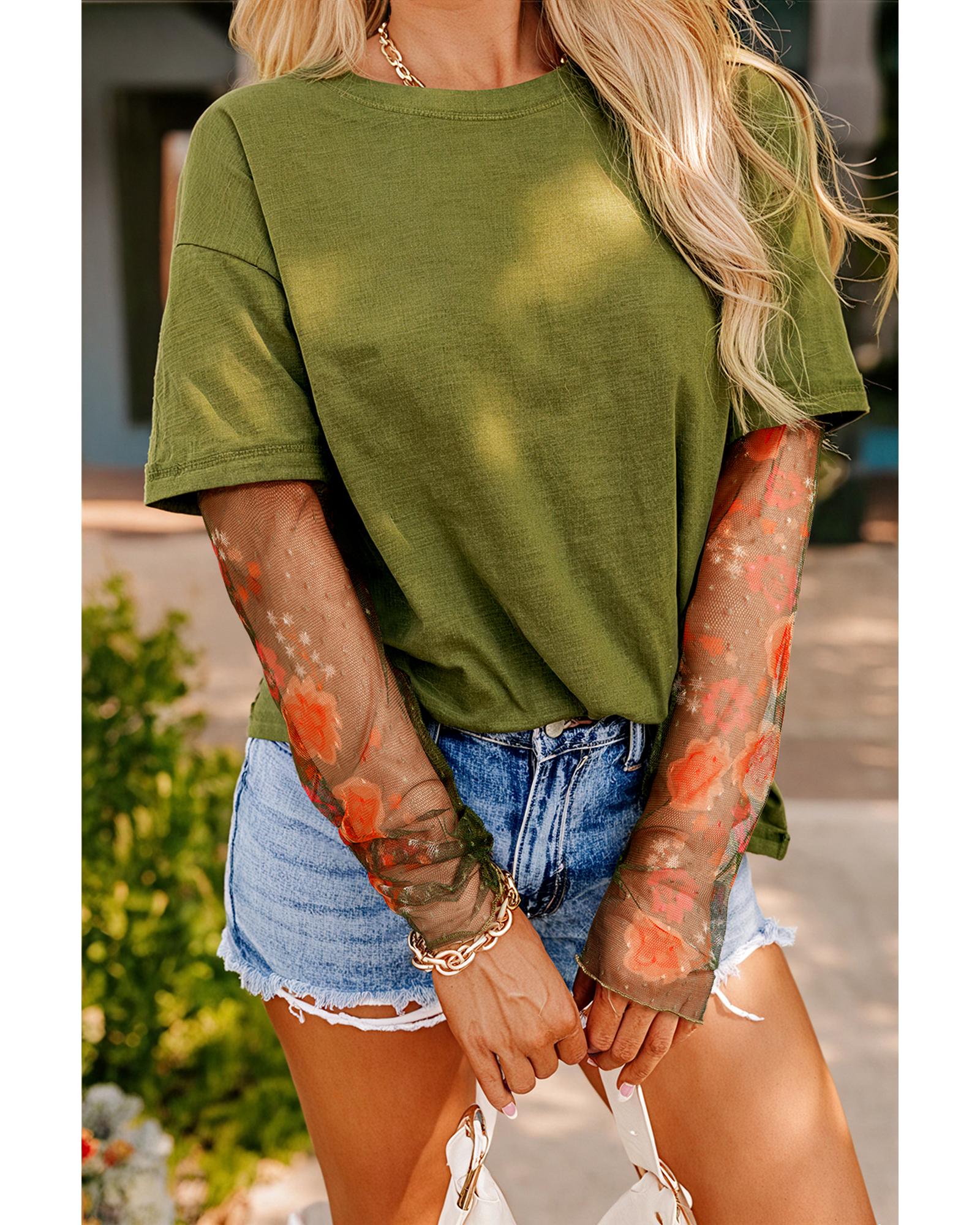 • Fern Green Faux Two Piece Floral Long Sleeve Patchwork Tee