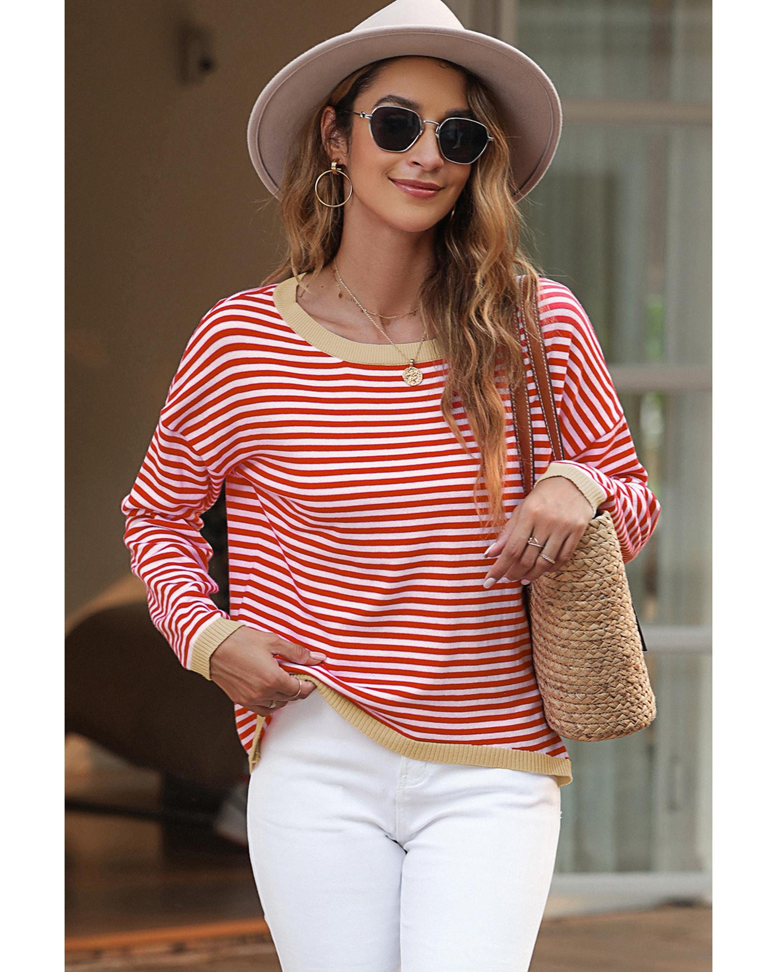 - Fiery Red Contrast Trimmed Striped Drop Shoulder Sweater