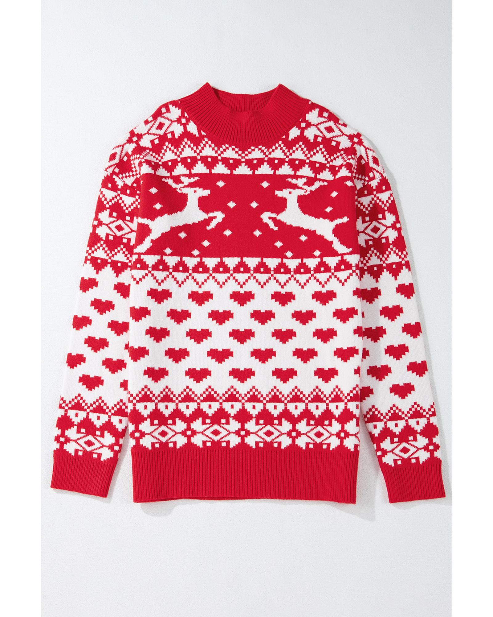 - Fiery Red Merry Christmas Reindeer Heart Pattern High Neck Sweater