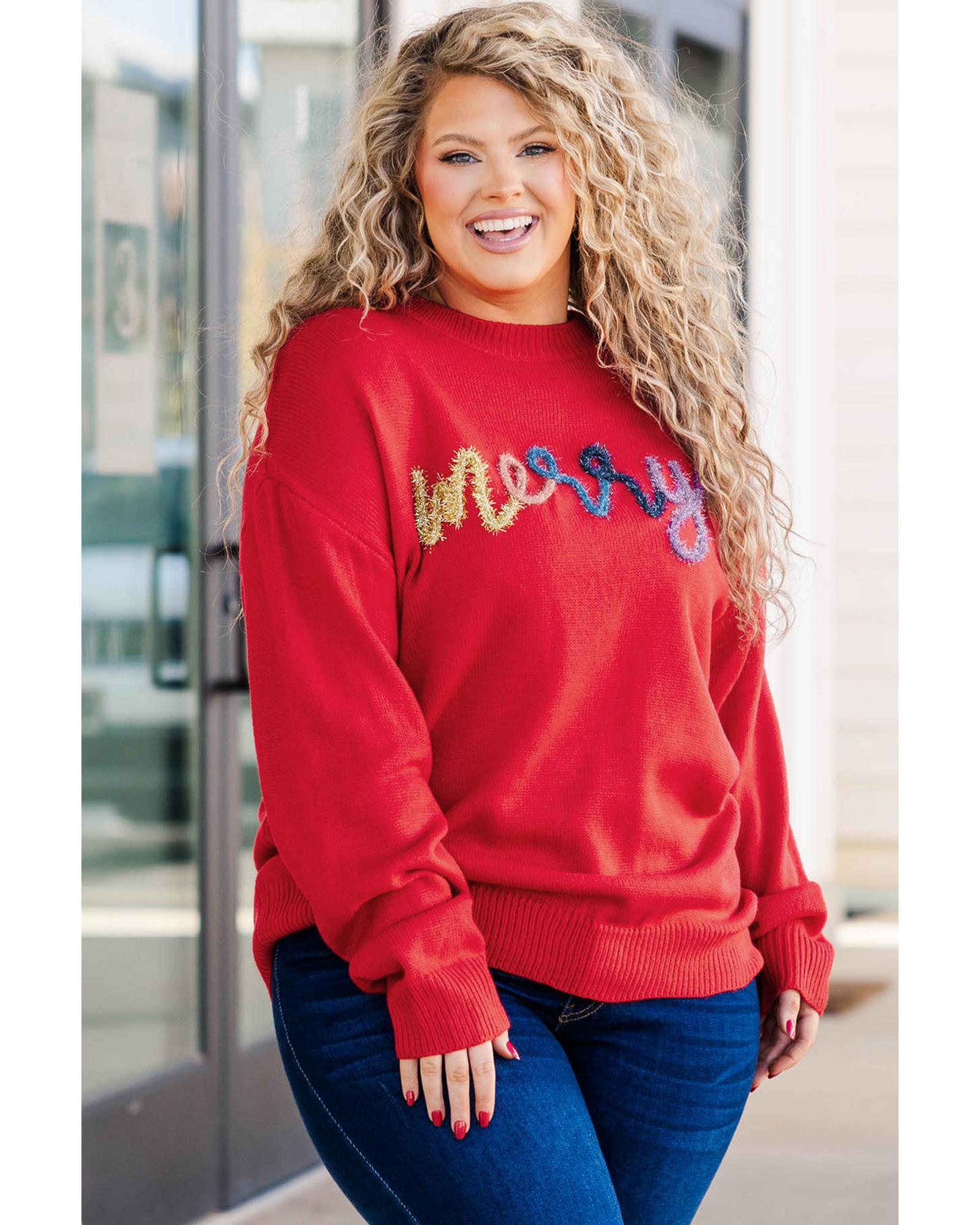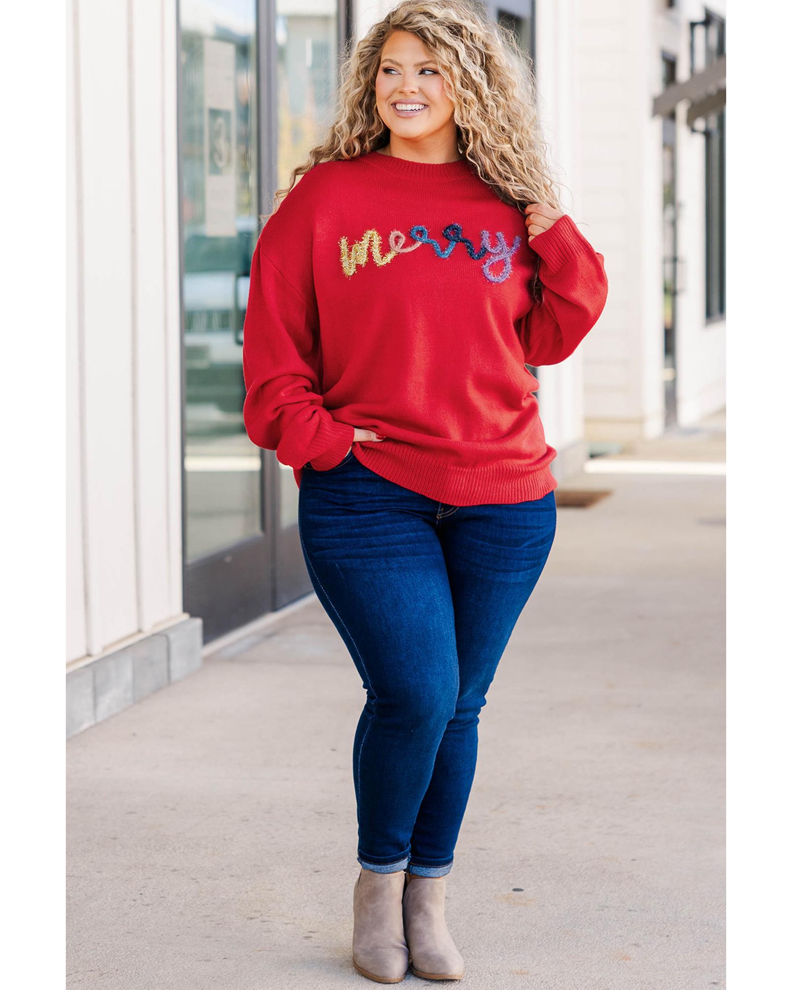Fiery Red Tinsel merry Pattern Drop Shoulder Plus Size Sweater – 3X