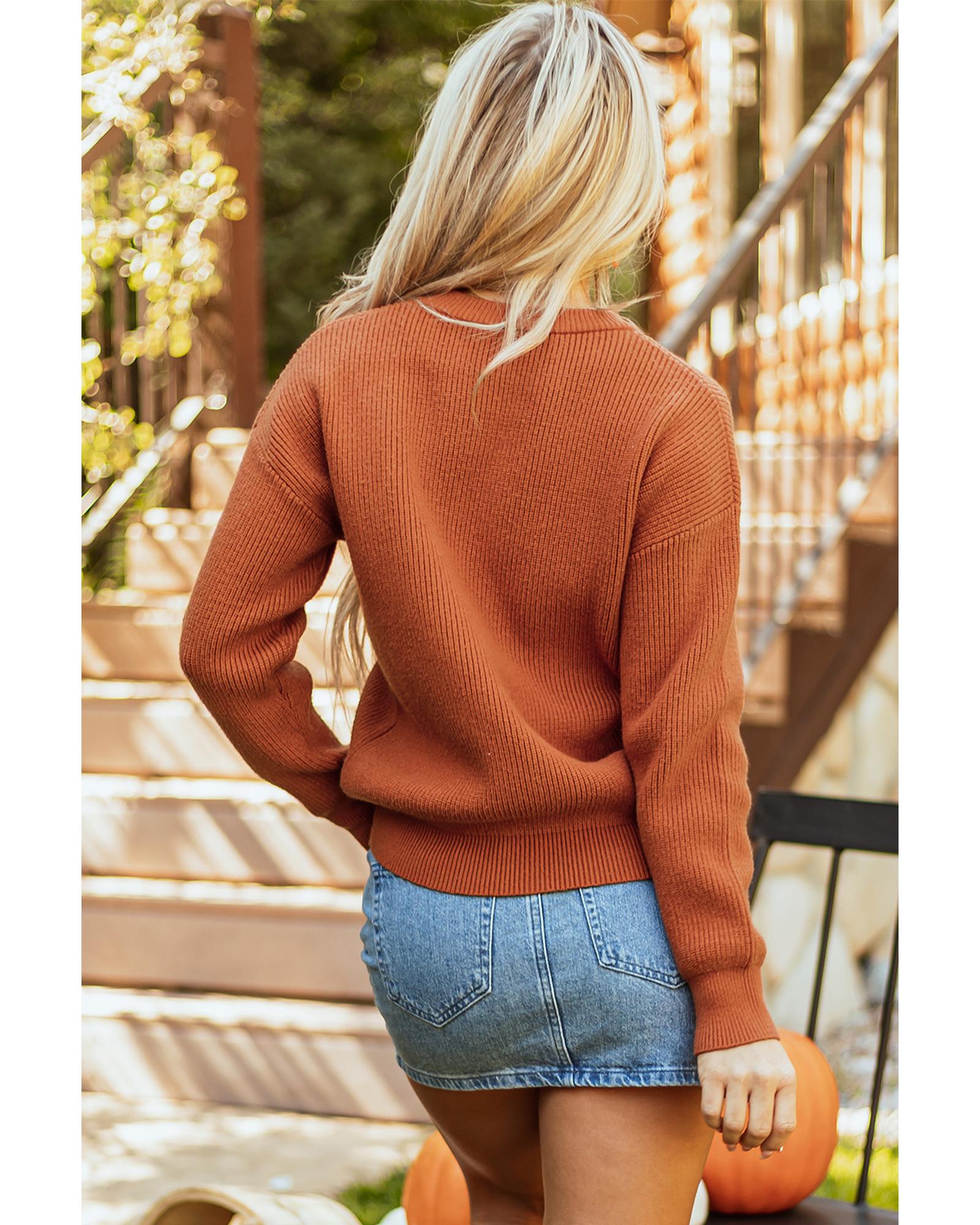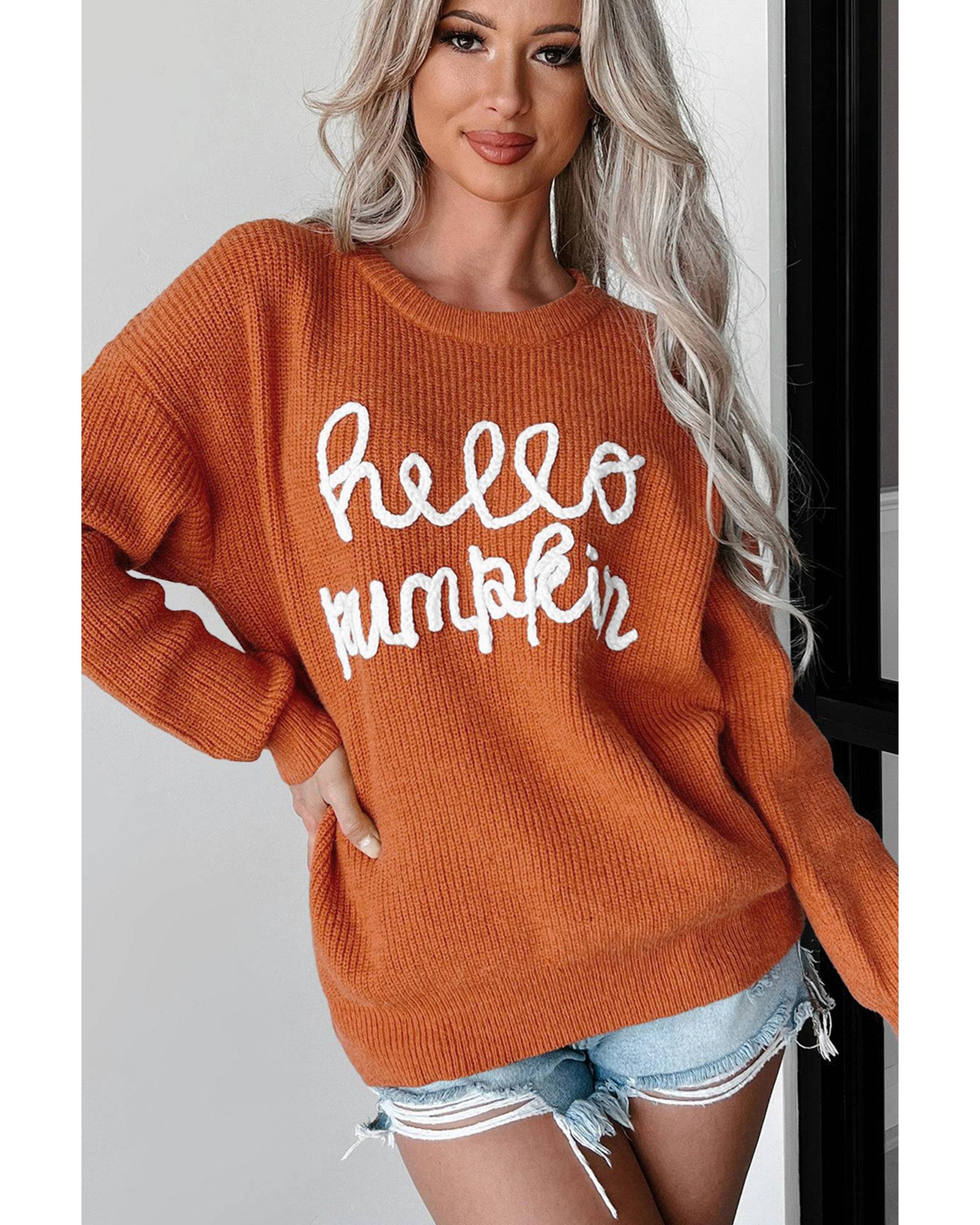 - Cozy sweater with a hello pumpkin text in a cursive font