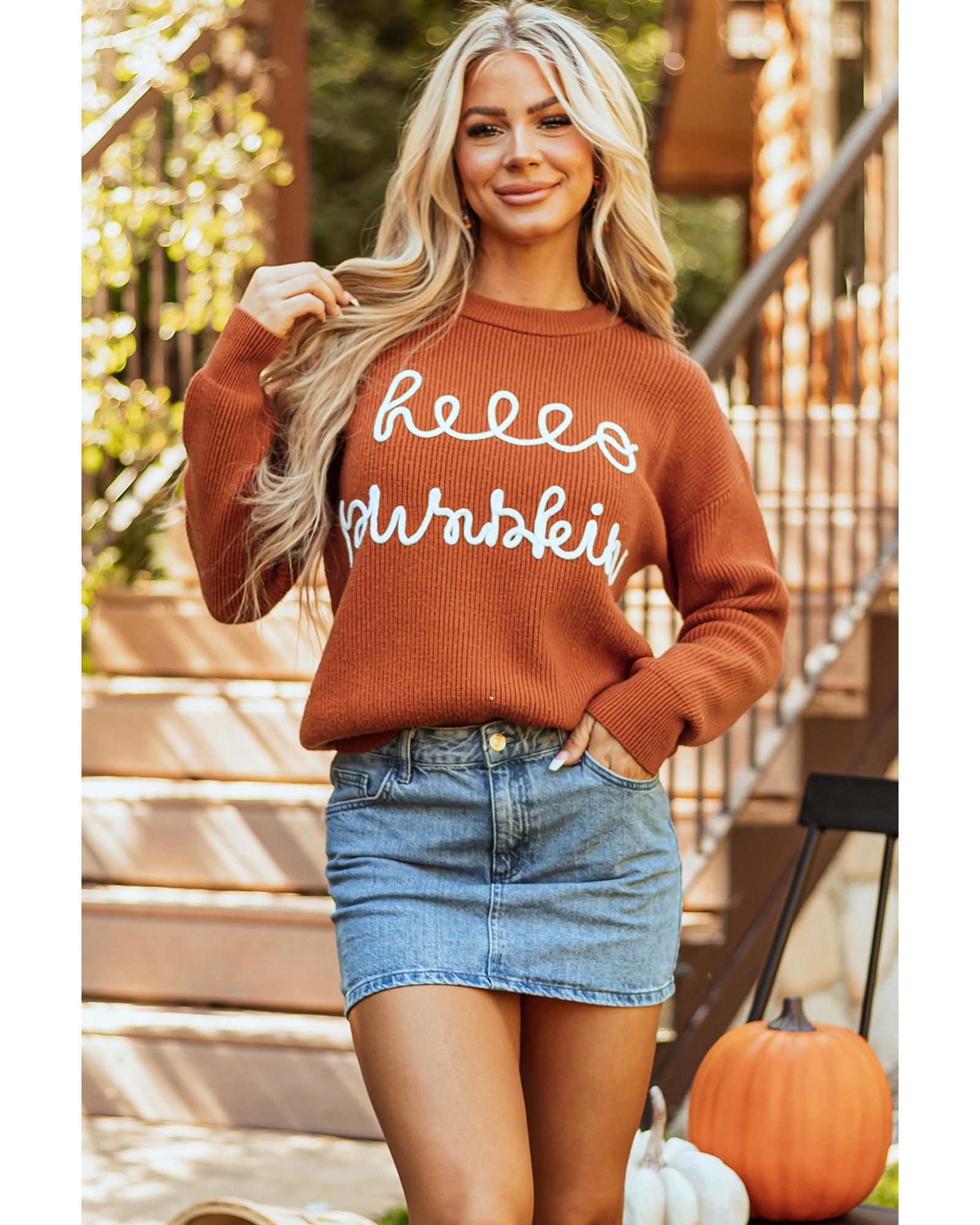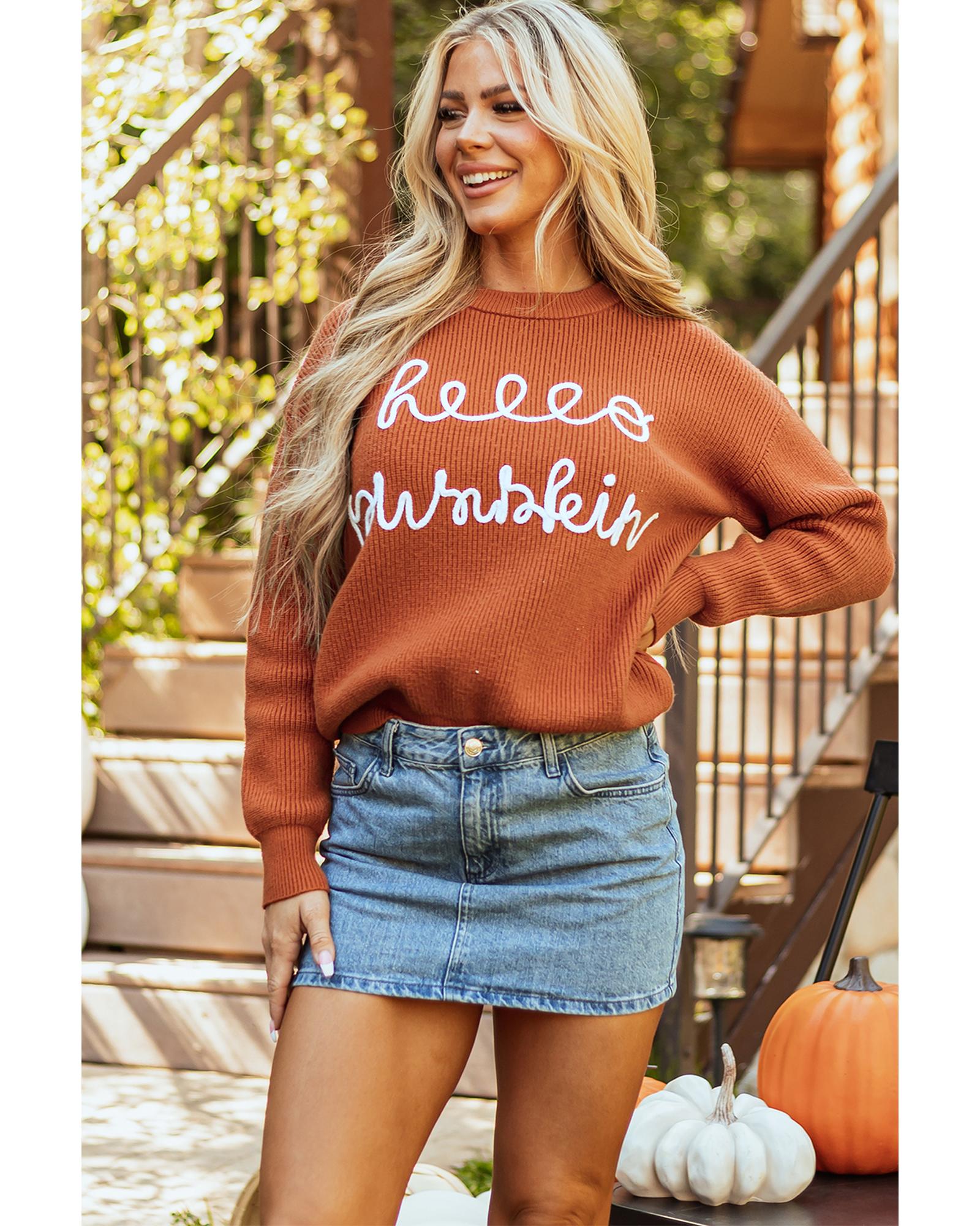 • Cozy sweater with a hello pumpkin text in a cursive font