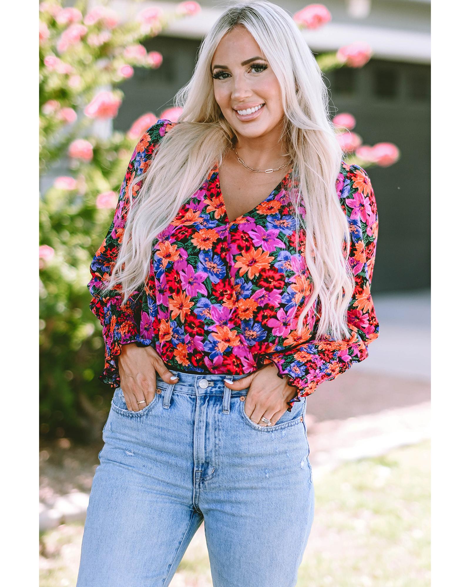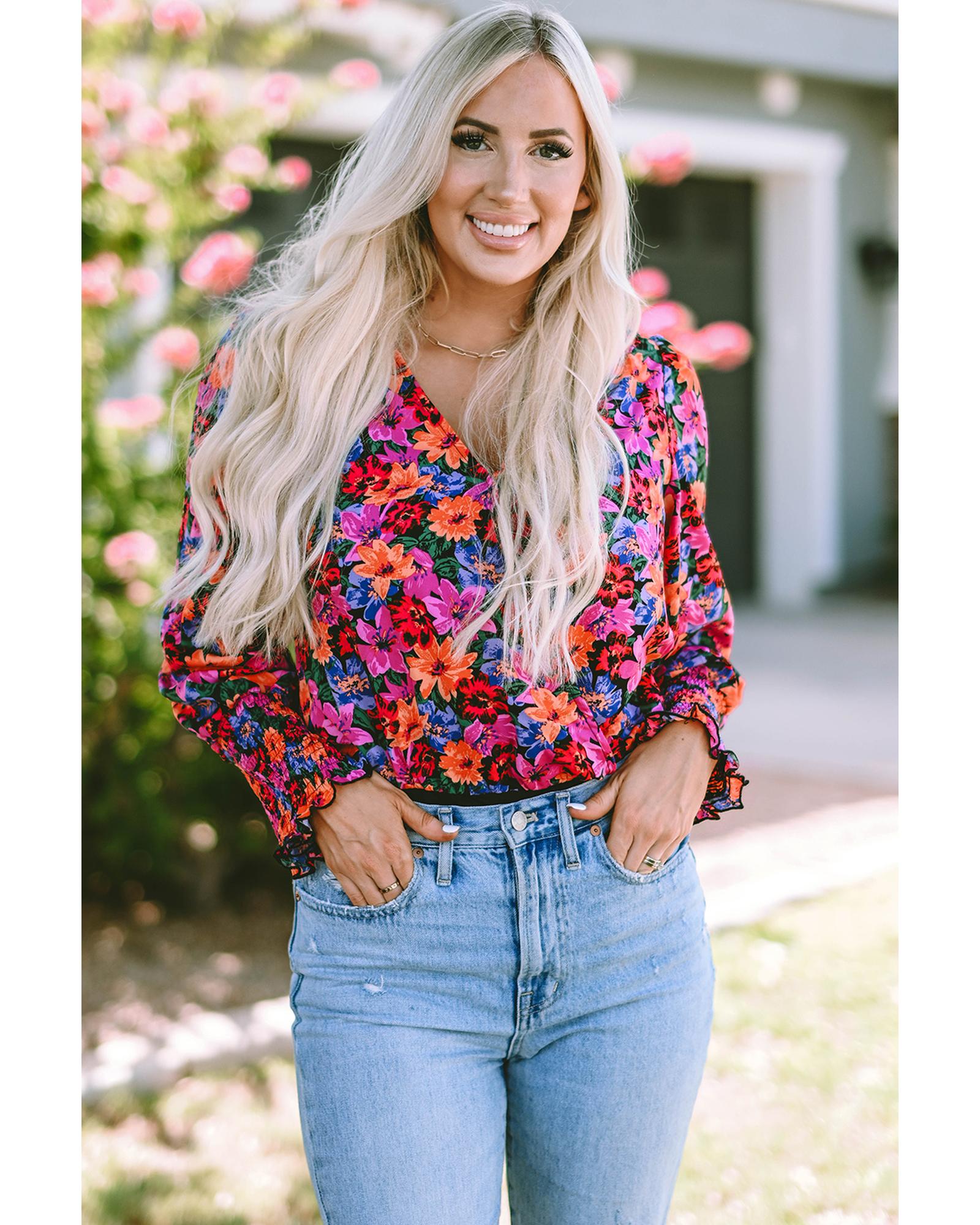 Floral Print Wrap V Neck Long Sleeve Bodysuit – L