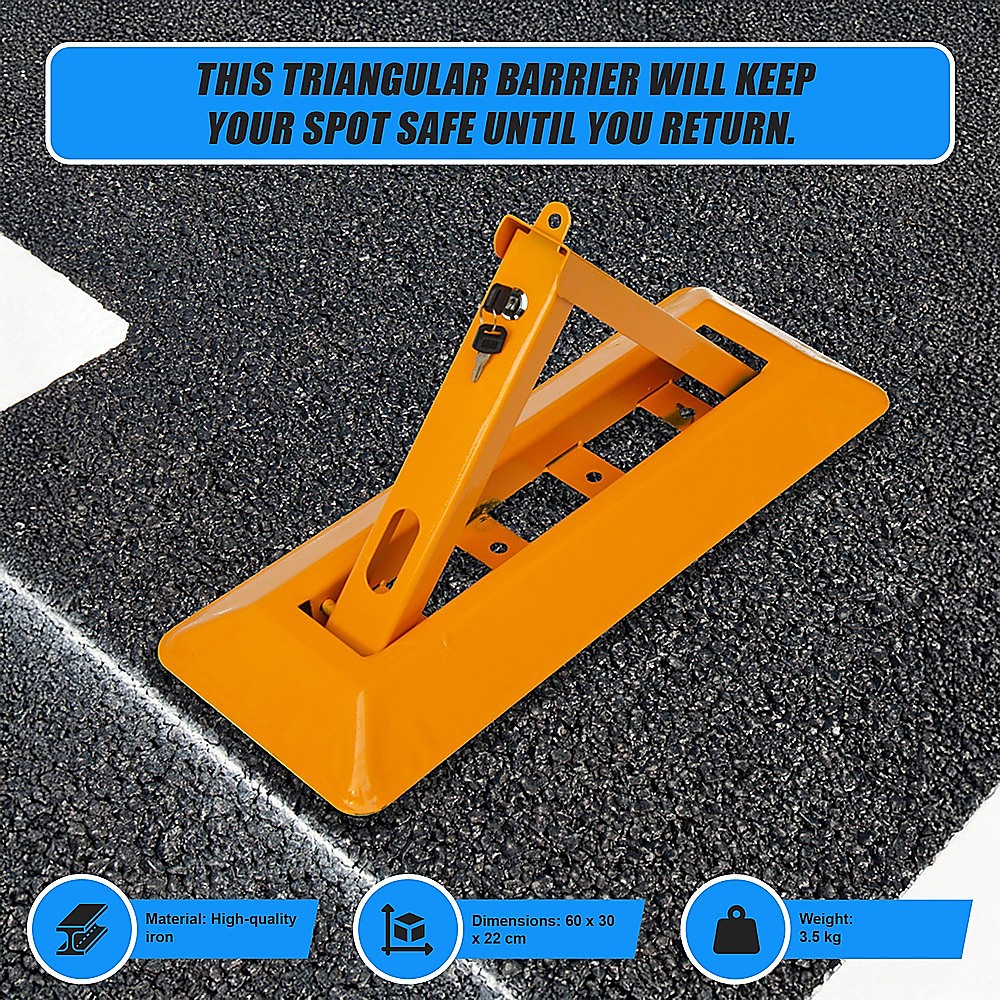 Fold it down to park and then fold it back up as you leave. This triangular barrier will keep your spot safe until you return. Water-proof and crash-resistant, this barrier will last for years, keeping your parking spot closed to anyone but you. It's even lockable, so no one but you can fold it down. Its vivid colours, reflective strips and triangular shape make it easy for other drivers to see and avoid your parking spot. If you're tired of walking long distances to work because someone's stolen your parking spot, this triangular bollard is your solution. Buy yours today!