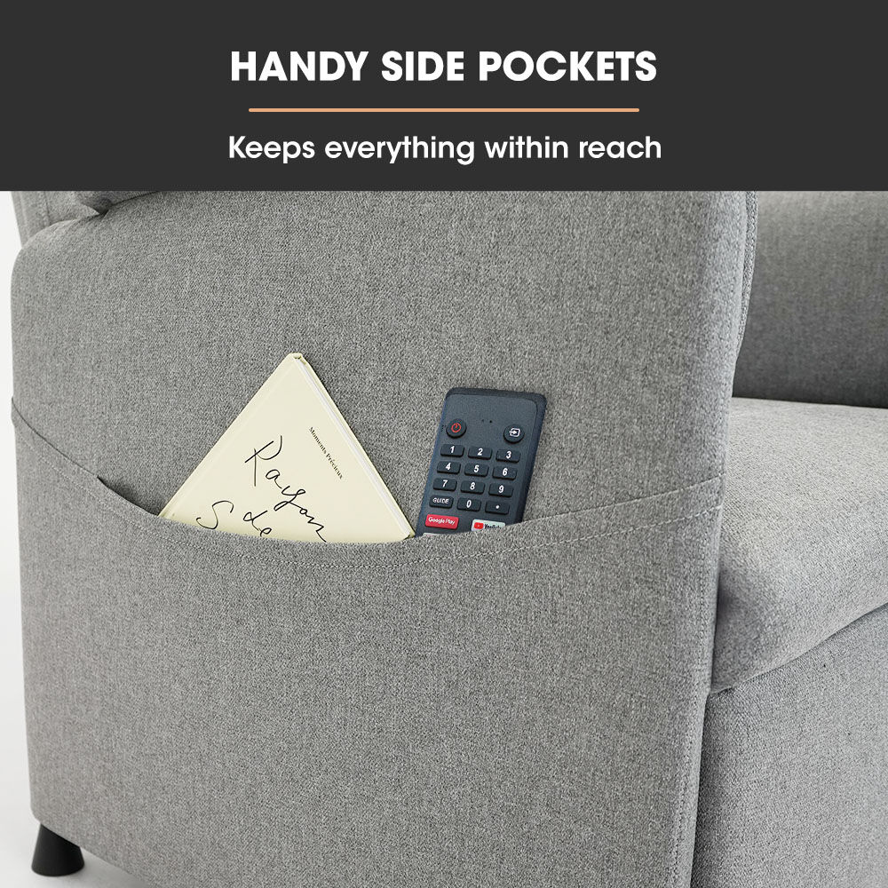 Upholstered in breathable fabric, the chair is generously padded from head to toe for a plush, supportive feel. A handy side pocket keeps remotes, books or magazines within arms reach, and with a 136kg weight capacity, its built for reliable, everyday use.