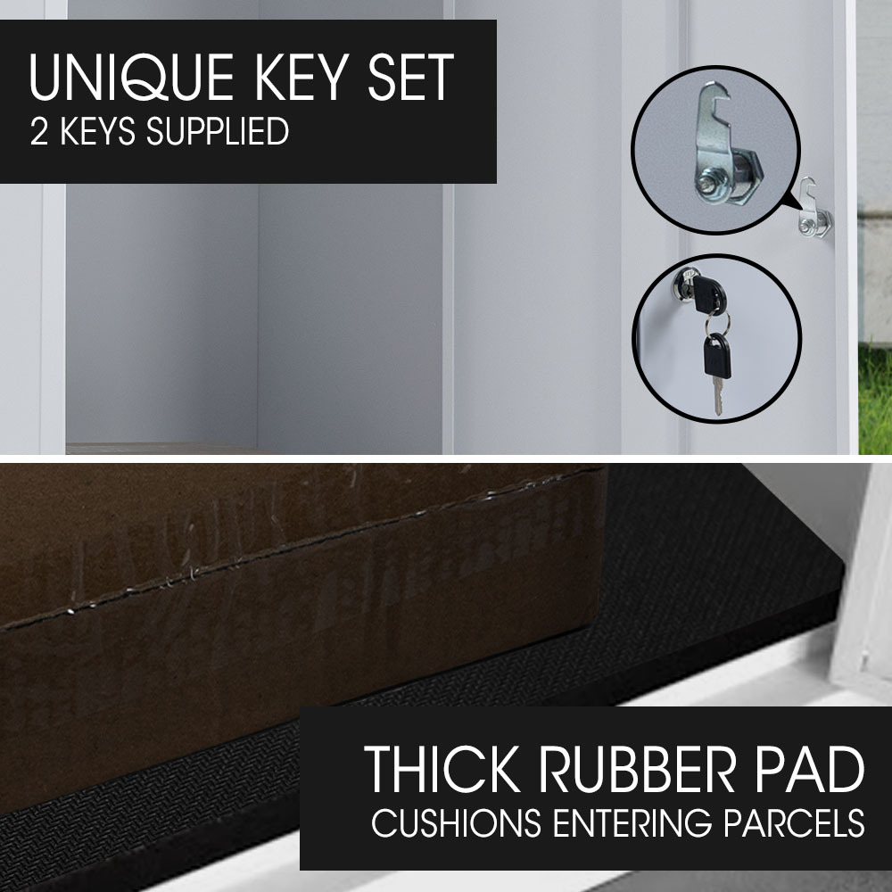 Its simple styling will complement any architectural style and look great in front of your home. Security is paramount with a secure L-shaped lid and theft-proof baffle design that prevents unwanted access to the storage chamber. Equipped with two unique keys, this parcel box guarantees exclusive access.