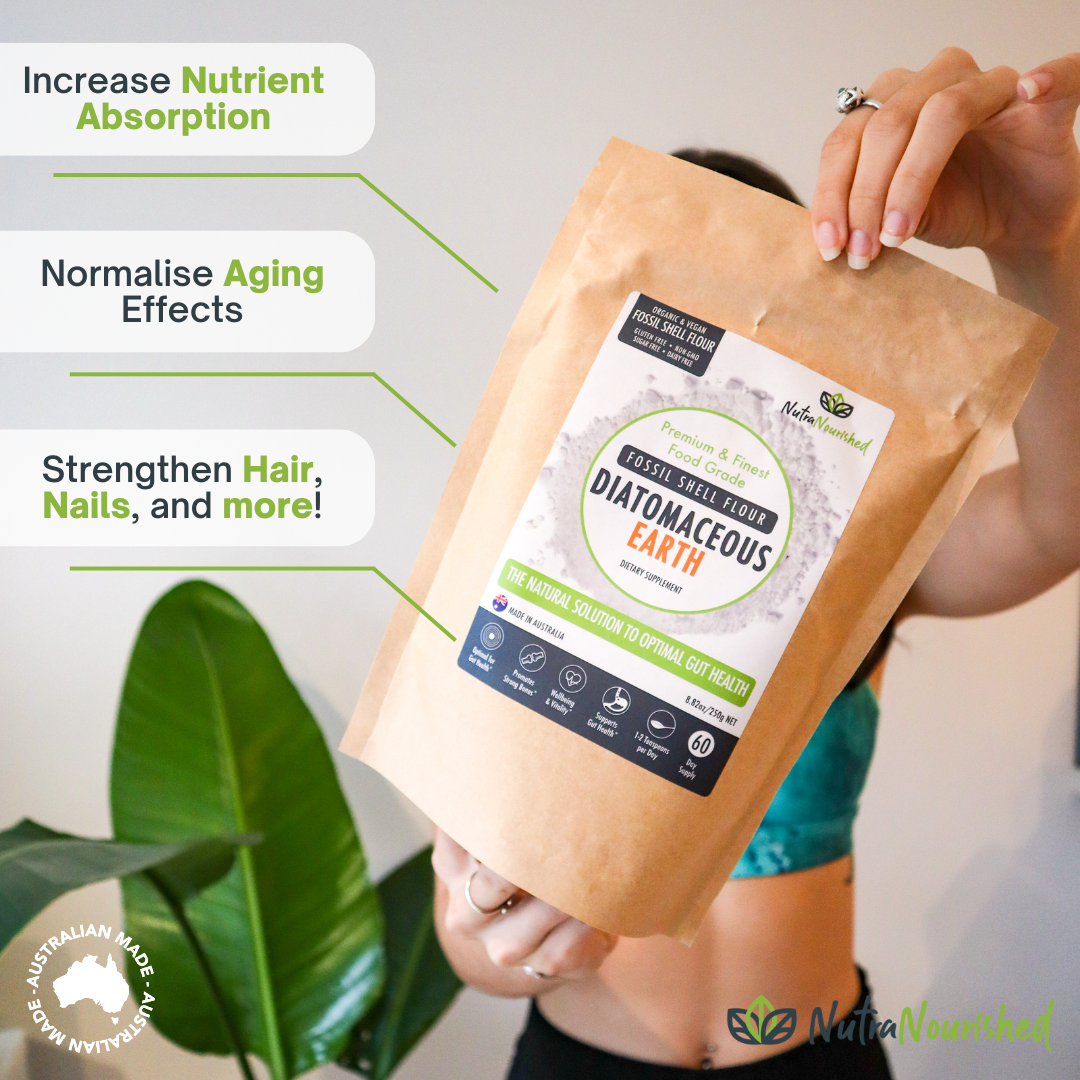 Diatomaceous earth is the most natural form of the mineral silica, which is vital for the formation of collagen, one of the most abundant compounds of the human body. Silica is found in things such as quartz, emerald, sand and fossils, and also in natural deposits found in the sediment of lakes and rivers. From these self-replenishing deposits, the Diatomaceous Earth can be harvested and cleaned up using a natural process, making it safe for us humans to consume.