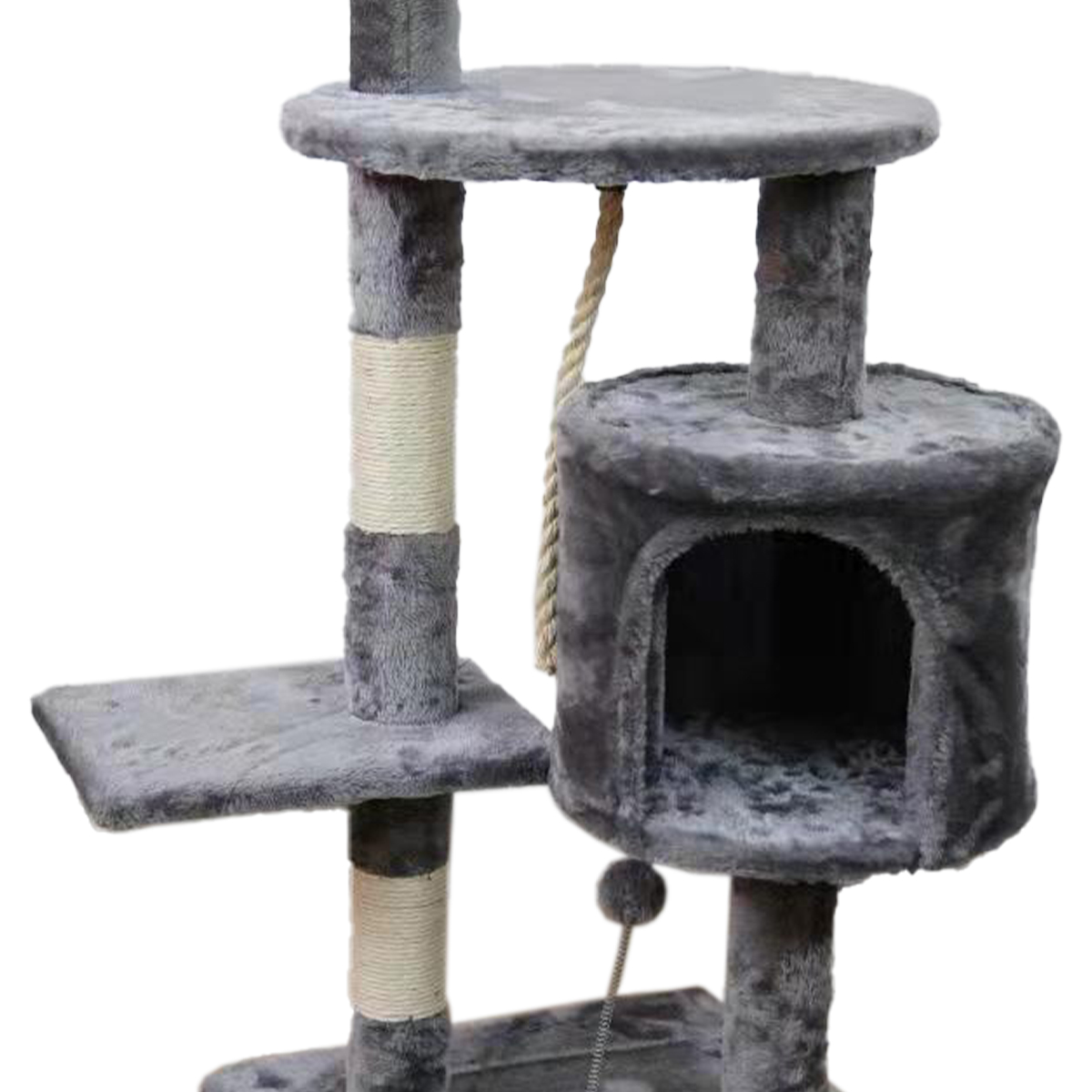 This sturdy 110cm cat tree features a durable wooden frame covered with luxe, plush fabric. Your cats will enjoy jumping to and from the three platforms or taking a nap in the round cubby house. There is also a spring toy, rope and a dangling ball for curious kitties to play with. Lastly, the scratching posts will help keep sharp claws away from your carpets or furniture.