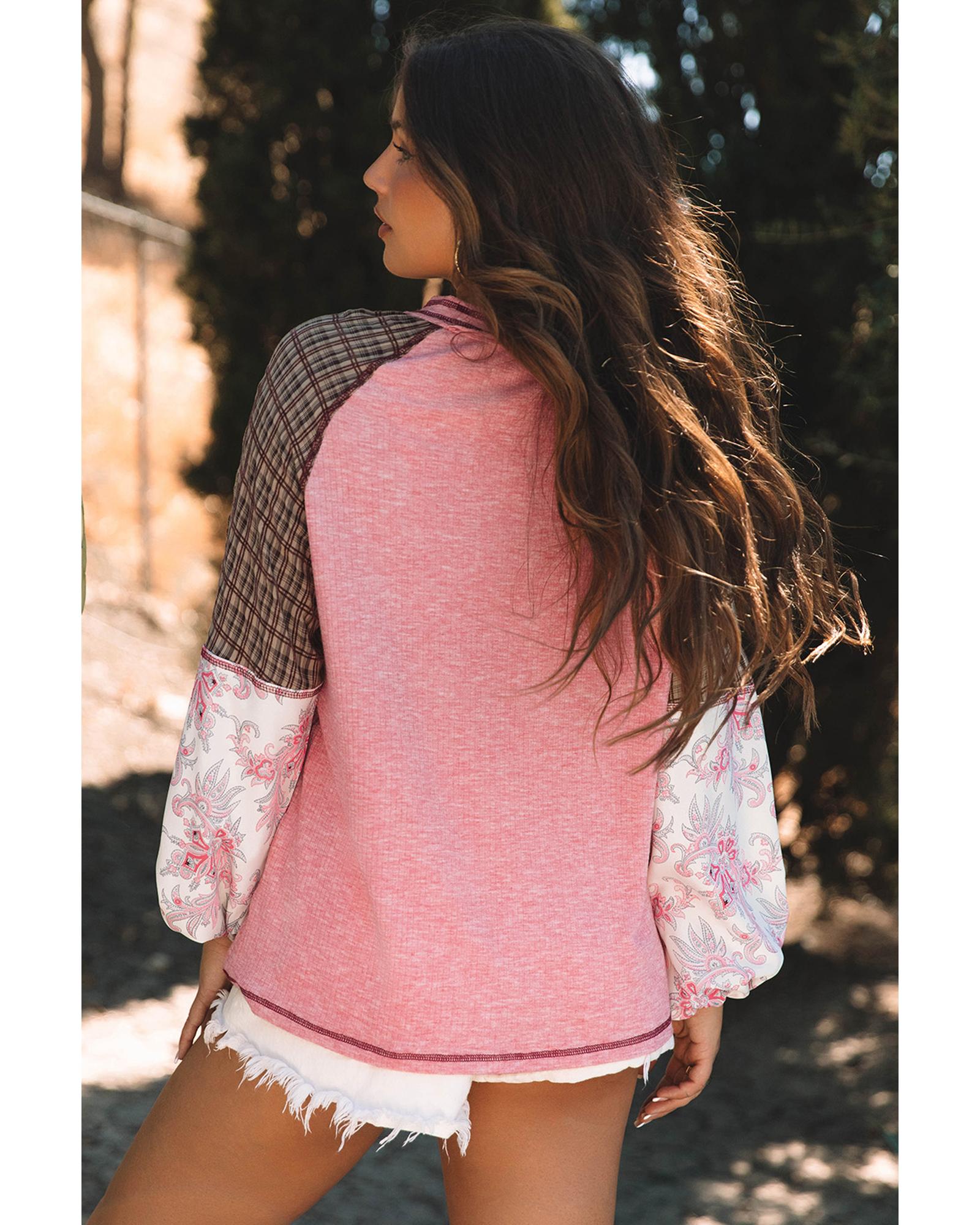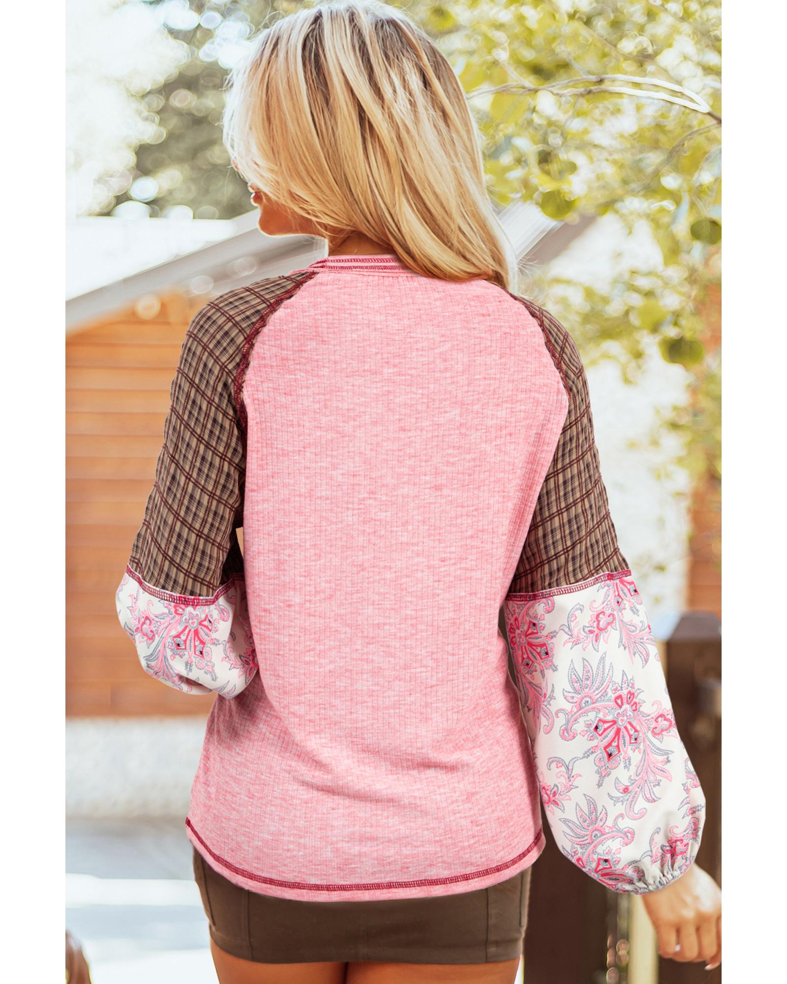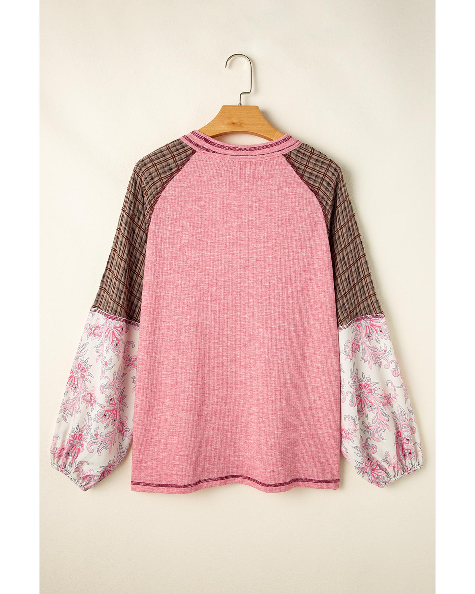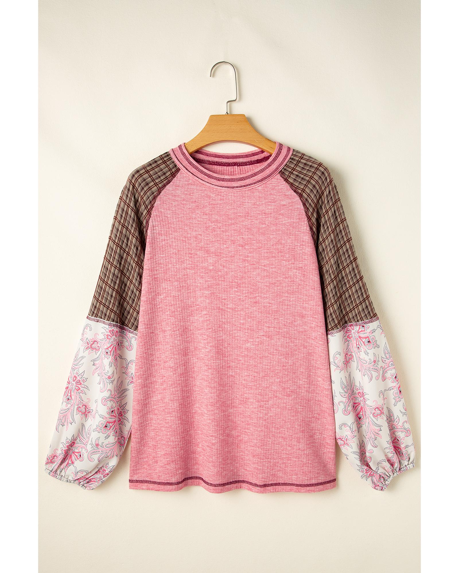 Fushia Mixed Print Raglan Sleeve Ribbed Knit Patchwork Blouse – M